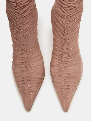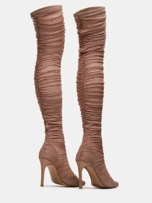 Elevate your style with the RASHIDA BLUSH MESH boot, featuring a sleek pointed toe and an over-the-knee silhouette crafted from breathable mesh. The slender stiletto heel adds height and sophistication, making this boot a perfect choice for a refined, fashion-forward look. Ideal for pairing with both dresses and tailored pieces, it combines daring design with expert craftsmanship.