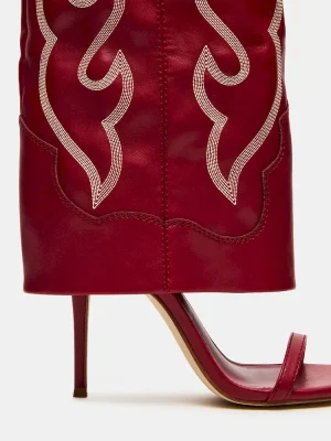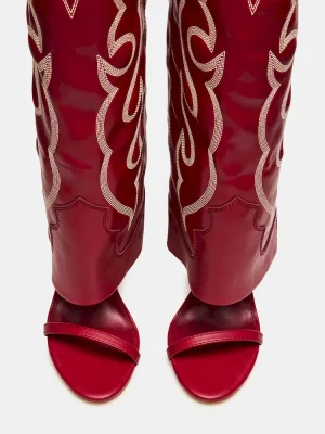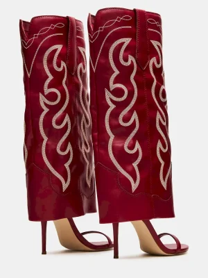 Expertly crafted and designed, the RAVINE WESTERN RED cuffed knee-high boot features an open toe and stiletto heel for a stylish touch. The rounded toe provides comfort while the sleek design adds a touch of sophistication. Elevate your look with this must-have boot.