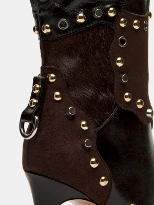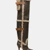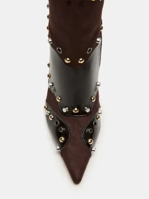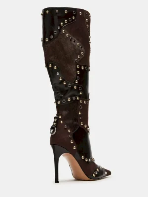 Elevate your style with the REVIVE BROWN MULTI WIDE CALF, a knee-high stiletto boot featuring a pointed-toe and distinctive studded detailing. Crafted for a sleek, confident look, this boot combines edgy accents with a refined silhouette, perfect for making a bold statement while maintaining elegance. Ideal for fashion-forward wearers seeking both sophistication and attitude in their footwear.