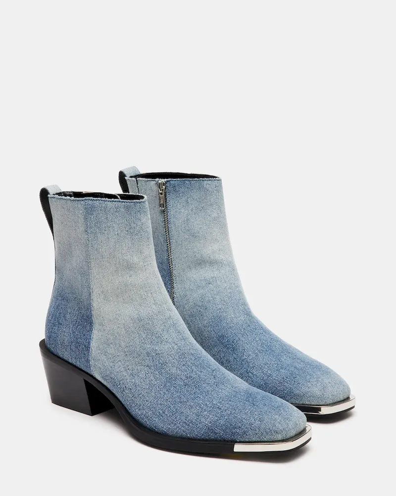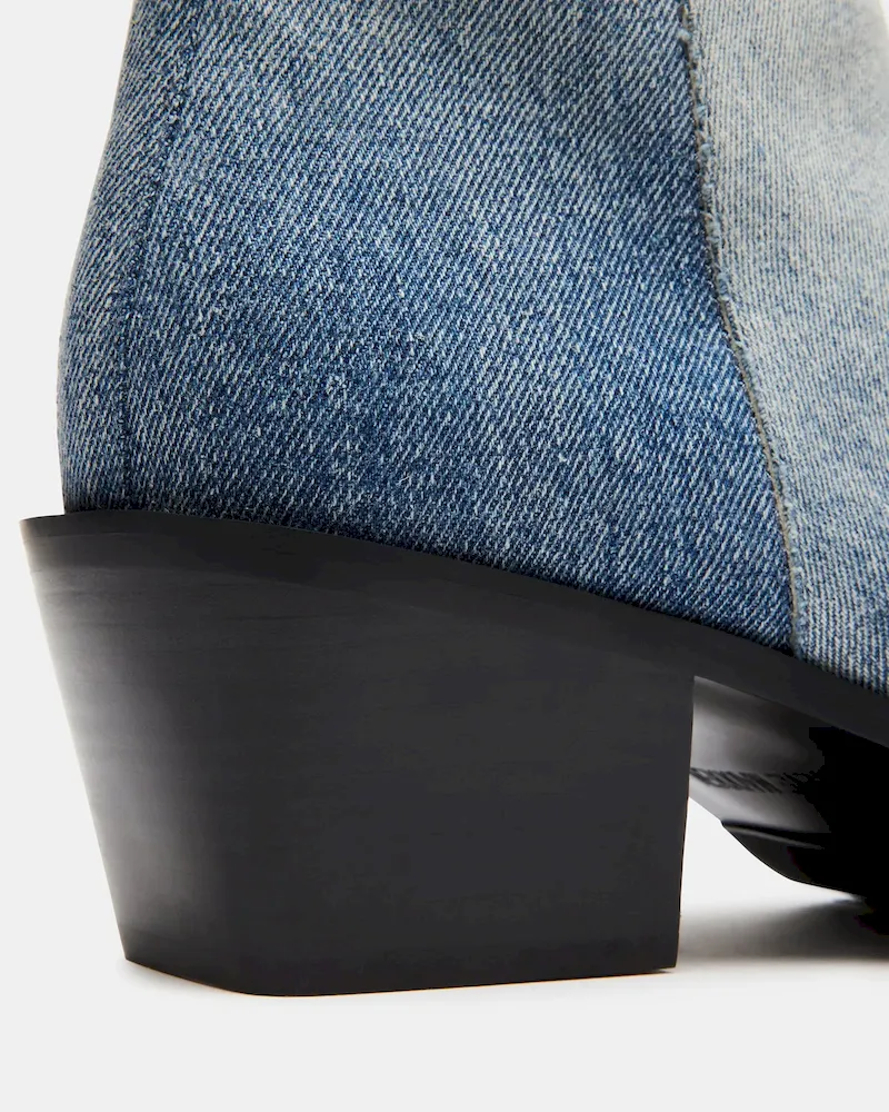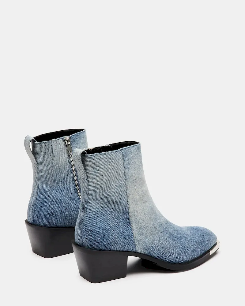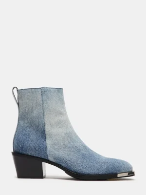 The RICHIE boot pairs an angled block heel with an ankle-height upper for an updated washed denim western-inspired look.