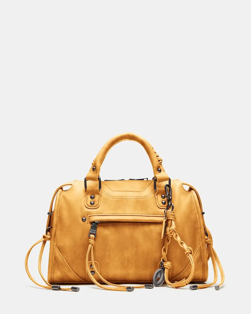Expertly crafted with a slouchy satchel design, this RIGGS bag is a top-handle bag that combines style and function. Featuring dome stud details and knotted fringe decals on a gusset with rounded bottom metal aglets, it also comes with an attachable crossbody strap for versatile wear—a must-have for any fashion-forward wardrobe.