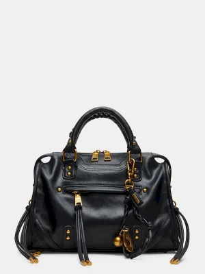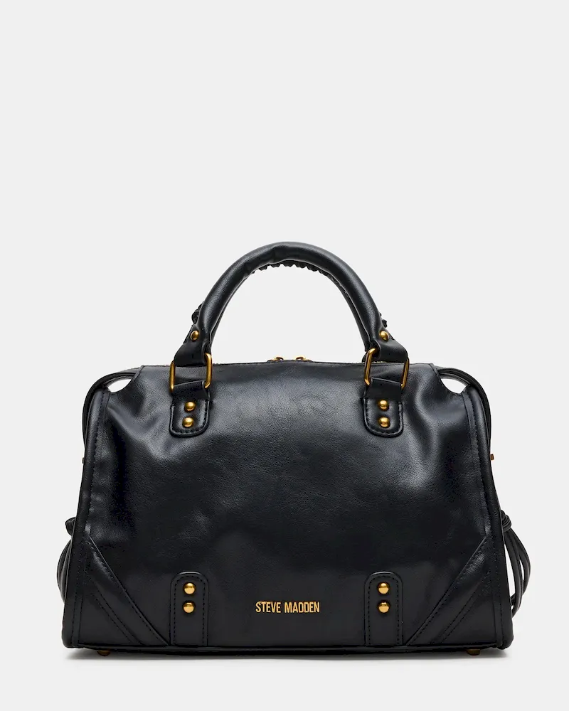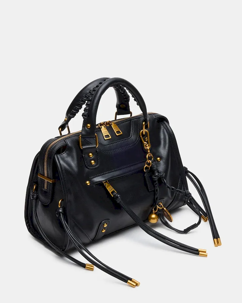 Expertly crafted with a slouchy satchel design, this RIGGS bag is a top-handle bag that combines style and function. Featuring dome stud details and knotted fringe decals on a gusset with rounded bottom metal aglets, it also comes with an attachable crossbody strap for versatile wear—a must-have for any fashion-forward wardrobe.