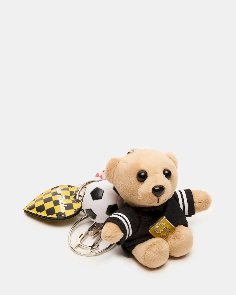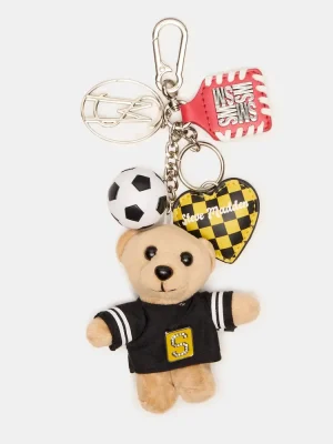 Add a playful touch to your bag with our attachable GOAL BAG CHARM. This charming accessory features a stuffed bear with a soccer ball charm, accompanied by a metal logo and puff checkered heart charm. The dog clip attachment ensures secure placement.