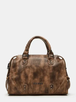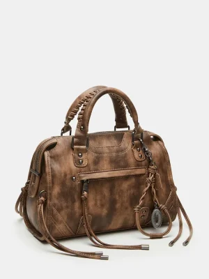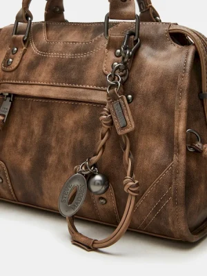 Expertly crafted with a slouchy satchel design, this RIGGS bag is a top-handle bag that combines style and function. Featuring dome stud details and knotted fringe decals on a gusset with rounded bottom metal aglets, it also comes with an attachable crossbody strap for versatile wear—a must-have for any fashion-forward wardrobe.