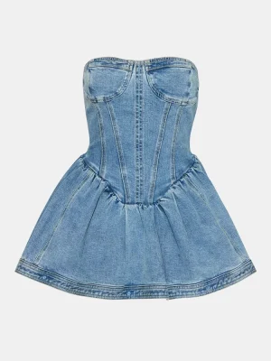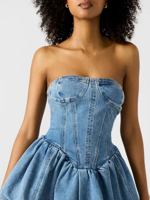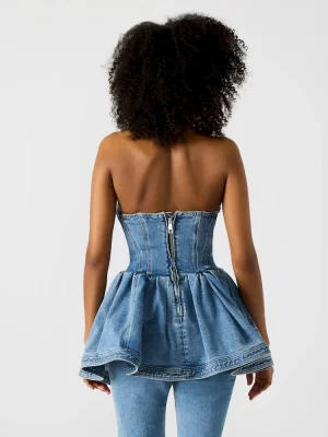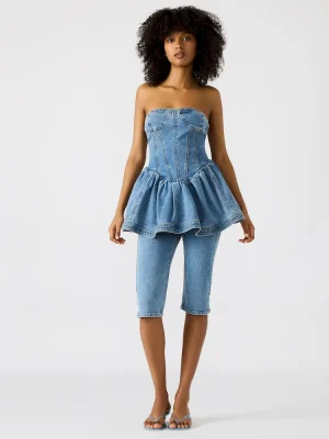 The RINA denim top is the perfect combination of style and comfort. Featuring a strapless design and a flattering peplum bottom, this top is both versatile and trendy. Enjoy the ease of movement and effortless style with this must-have addition to your wardrobe.
