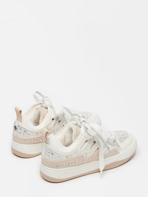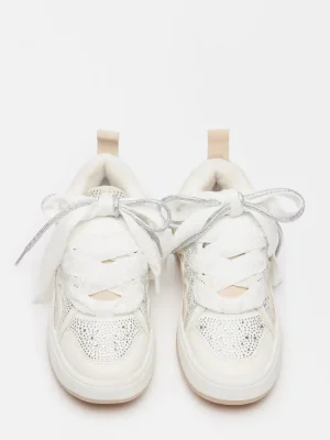 EXCITING + INDULGENT + ATHLETICLayered texture gives the ROARING White Rhinestones platform sneakers their signature look, with a wider set of laces crossed over the first set using cutout panels along the sides of the shoe. Rhinestone embellishment finishes the design with a touch of sparkle.