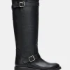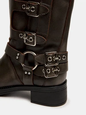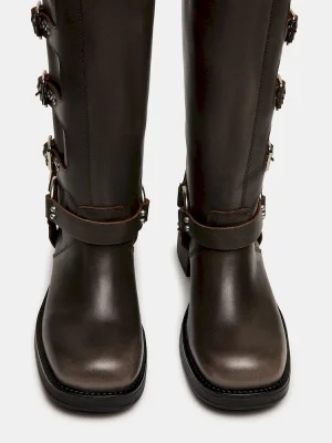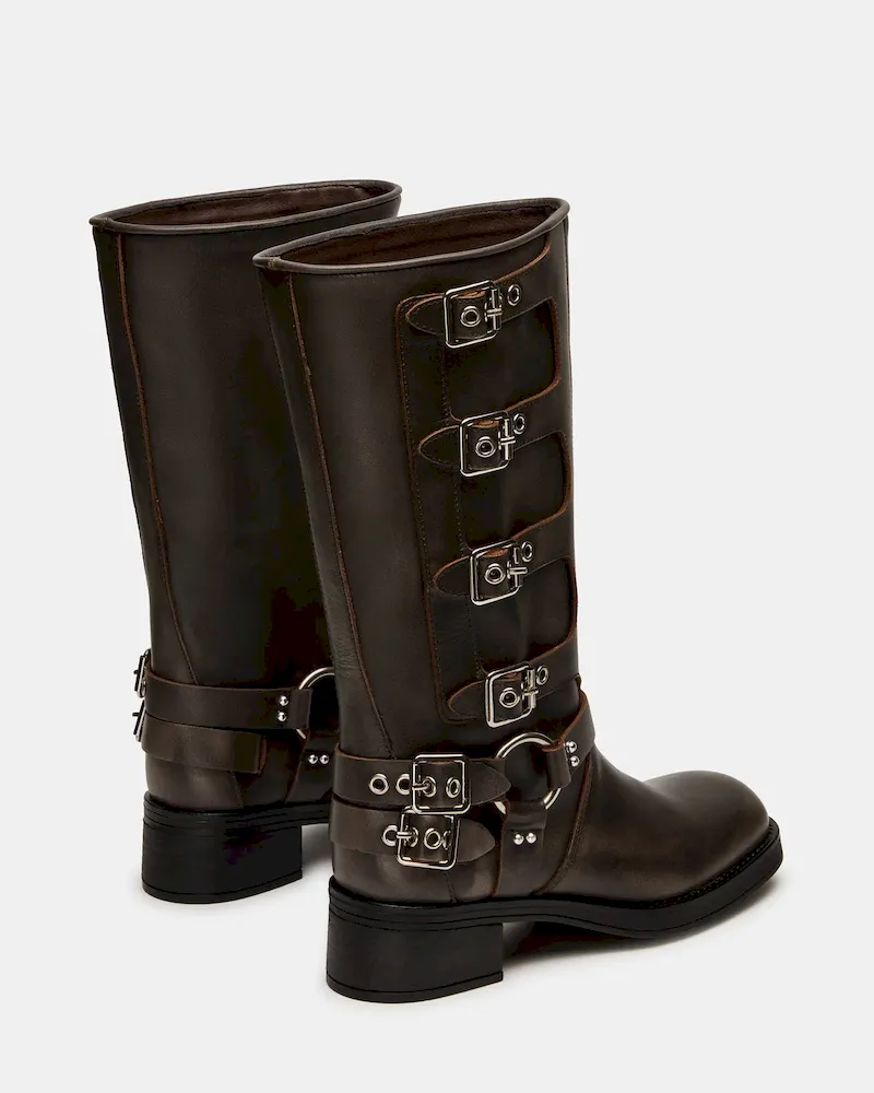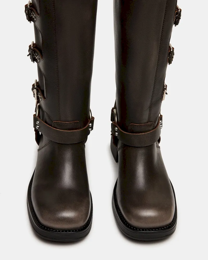 The ROCKY BROWN DISTRESSED WIDE CALF knee boot features the wide profile of an engineer boot with harness and buckle hardware adding an industrial edge and giving the design an adjustable fit.
