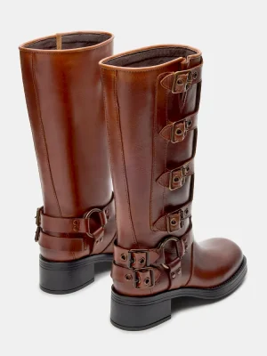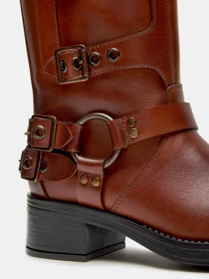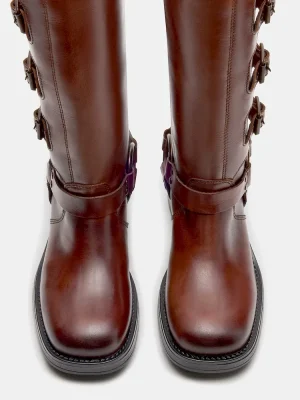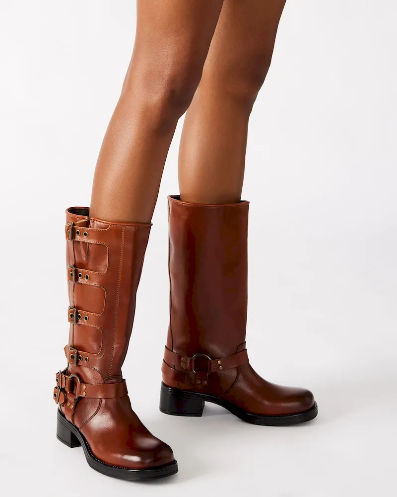 The ROCKY knee boot features the wide profile of an engineer boot with harness and buckle hardware adding an industrial edge and giving the design an adjustable fit.