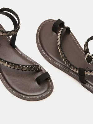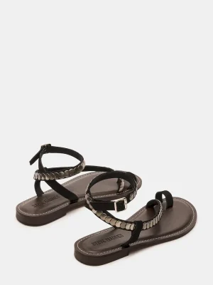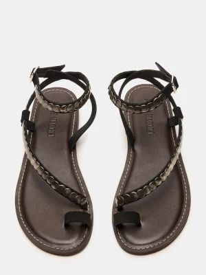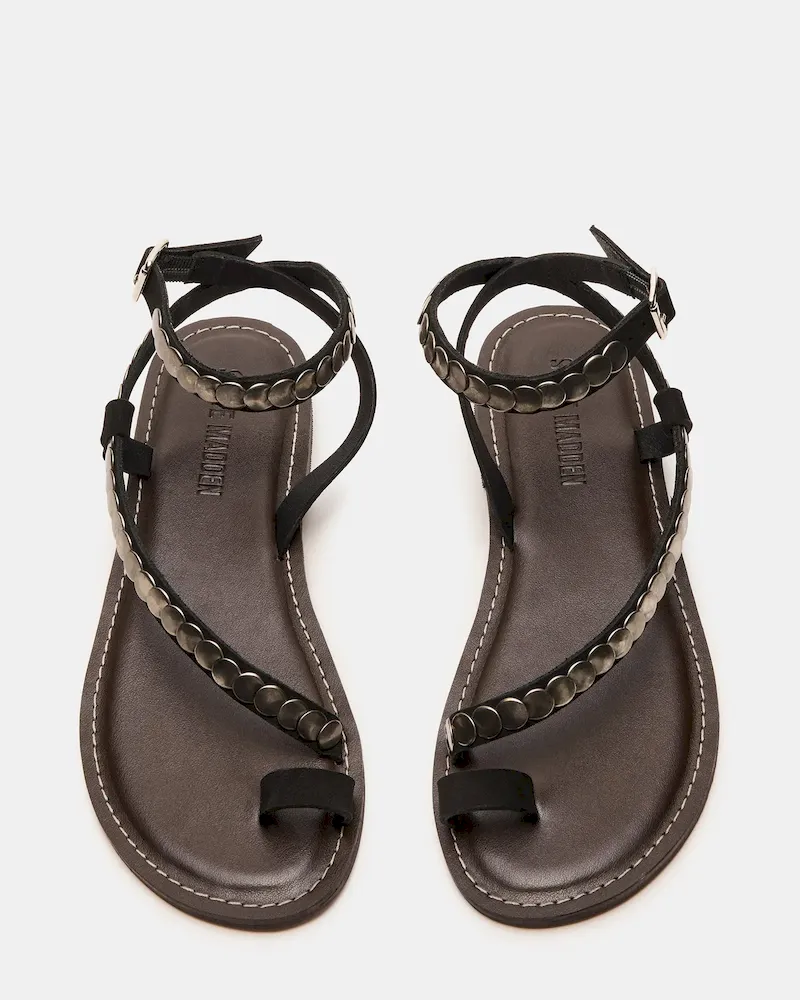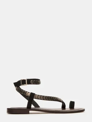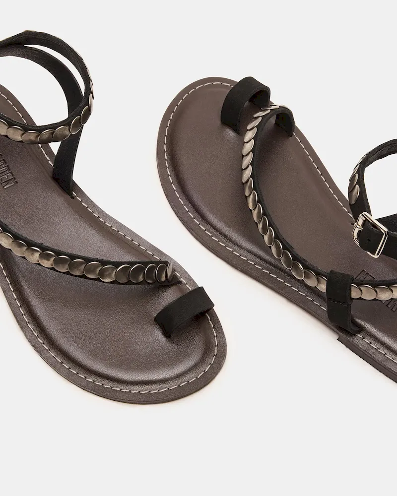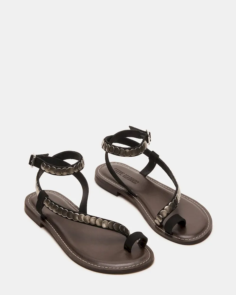 The SAGA – a strappy flat sandal featuring a rounded toe and secure ankle strap. With its sleek design, this sandal provides both style and comfort for any occasion. The perfect choice for those seeking a secure fit with added elegance.