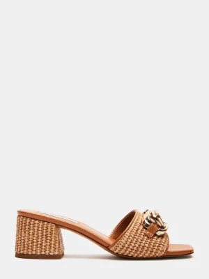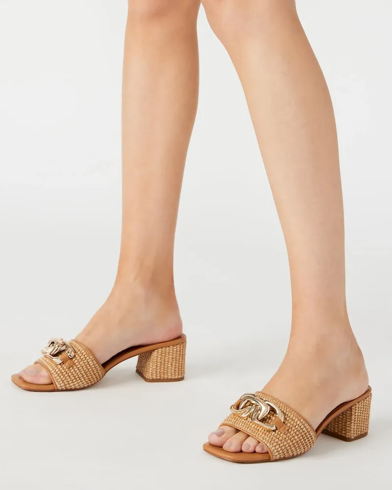 POLISHED + CHIC + CONTEMPORARYThe SANTANA block heel highlights contrasting textures with woven raffia accents and chunky chain hardware across the top of the slide strap.