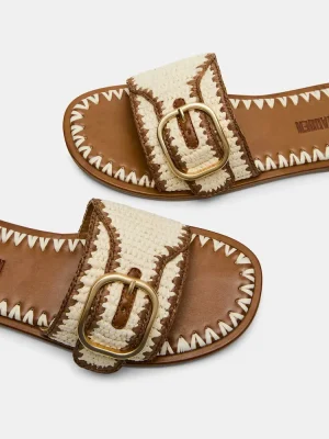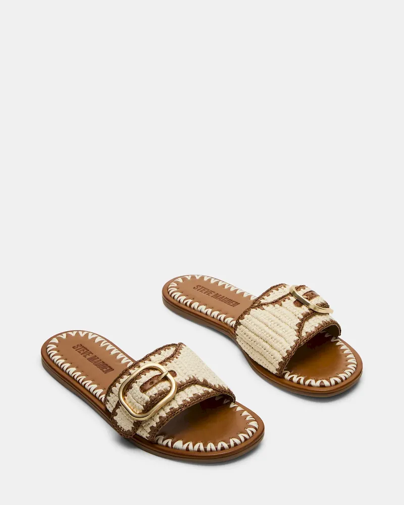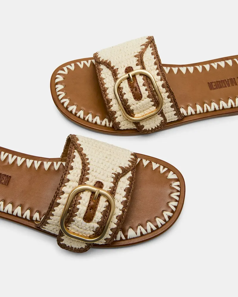 Expertly crafted with a flat sole and buckle decal, the SEABREEZE raffia sandal offers both style and functionality. Slip into comfort with the convenient slide design, perfect for all-day wear. Elevate any outfit with this versatile sandal, which is ideal for any occasion.