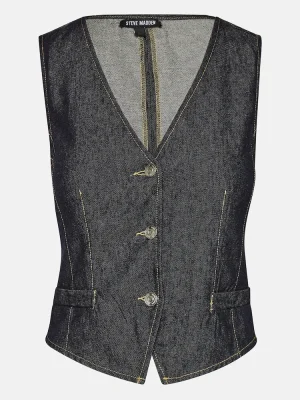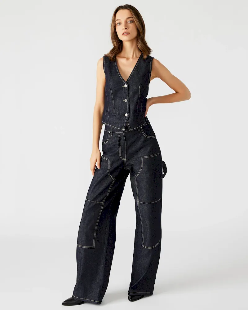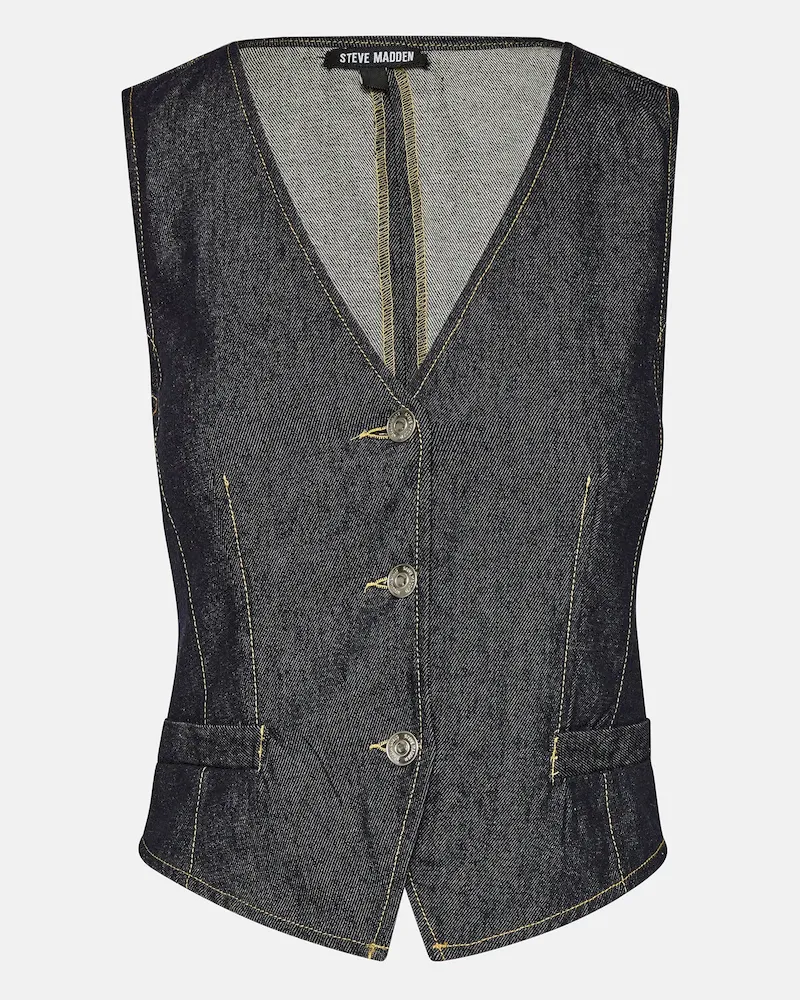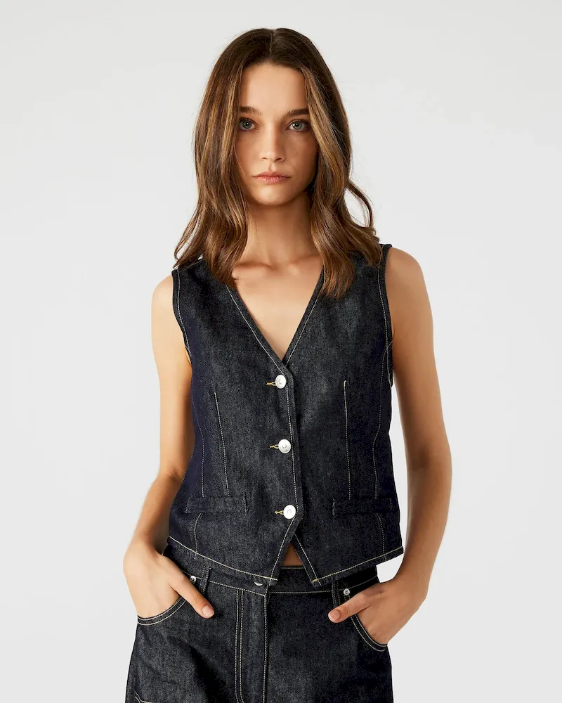 Introducing our SELENE denim vest – a stylish and versatile addition to your wardrobe. Made from high-quality dark denim fabric, this vest features a matching set design and convenient button-up closure. Perfect for layering, this versatile top is a must-have for any fashion-forward individual.