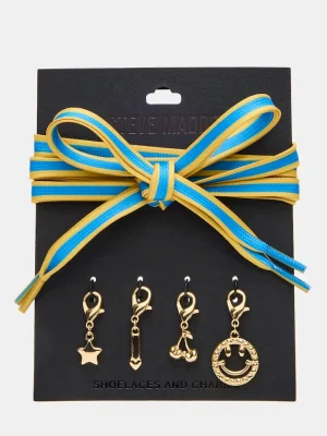 These stylish SHOE LACES AND CHARMS are the perfect accessory for any shoe. Adorned with a cute cherry charm, heart pin charm, star charm, and smiley face charm, they add a touch of femininity to your look. The striped bow adds a charming detail, making you stand out in any crowd. Elevate your style with these elegant shoe laces and charms.