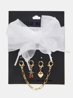These stylish SHOE LACES AND CHARMS are the perfect accessory for any shoe. Adorned with a cute heart charm and cherry charm, they add a touch of femininity to your look. The bow adds a charming detail, making you stand out in any crowd. Elevate your style with these elegant shoe laces and charms.