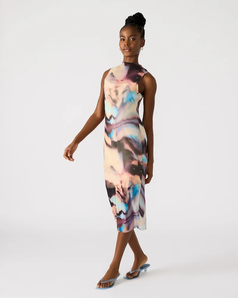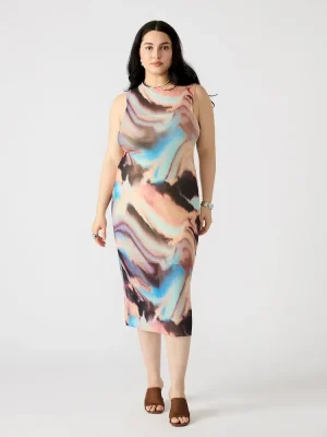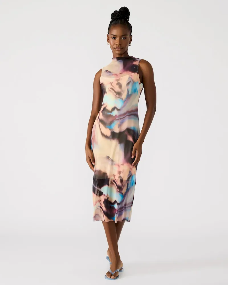 Introducing the SIDRA dress. A sleeveless midi dress with a unique, eye-catching tie-dye design. Perfect for any occasion, this dress offers both style and comfort. Add a touch of color to your wardrobe with this must-have dress.