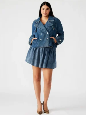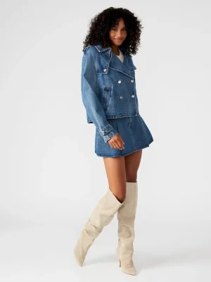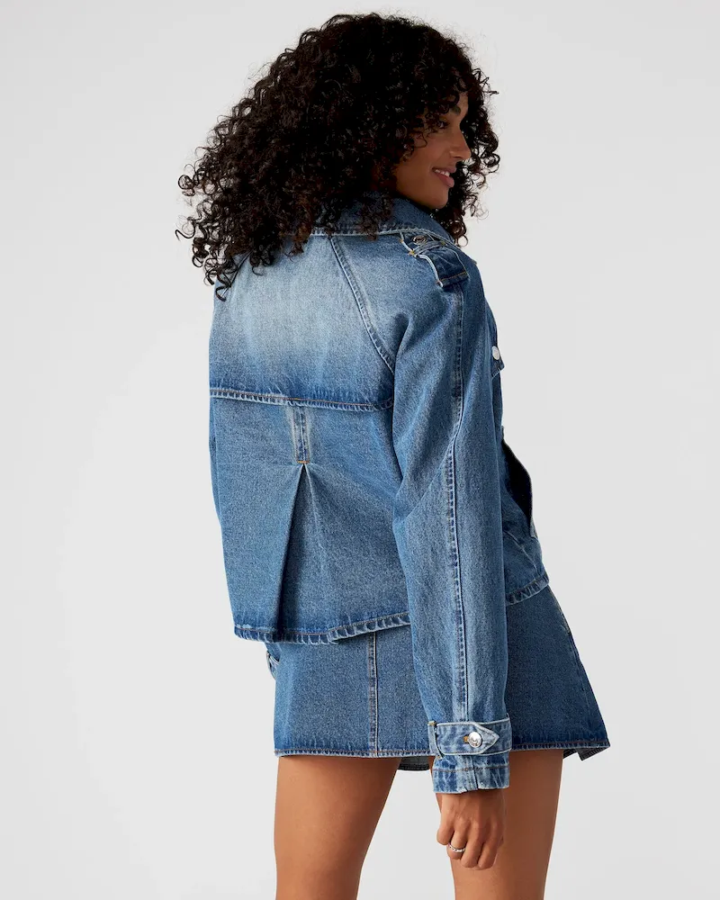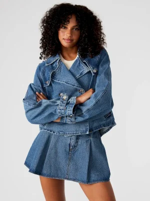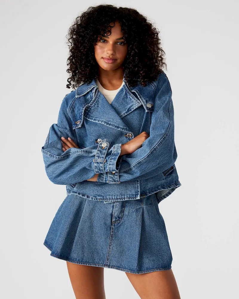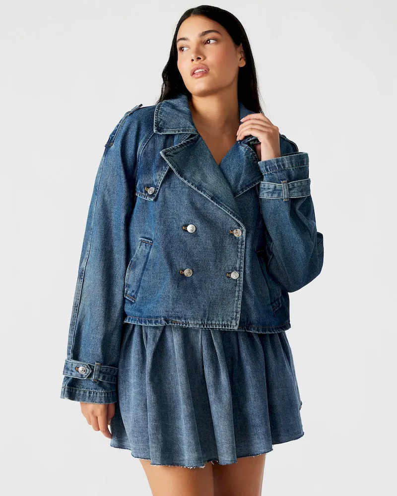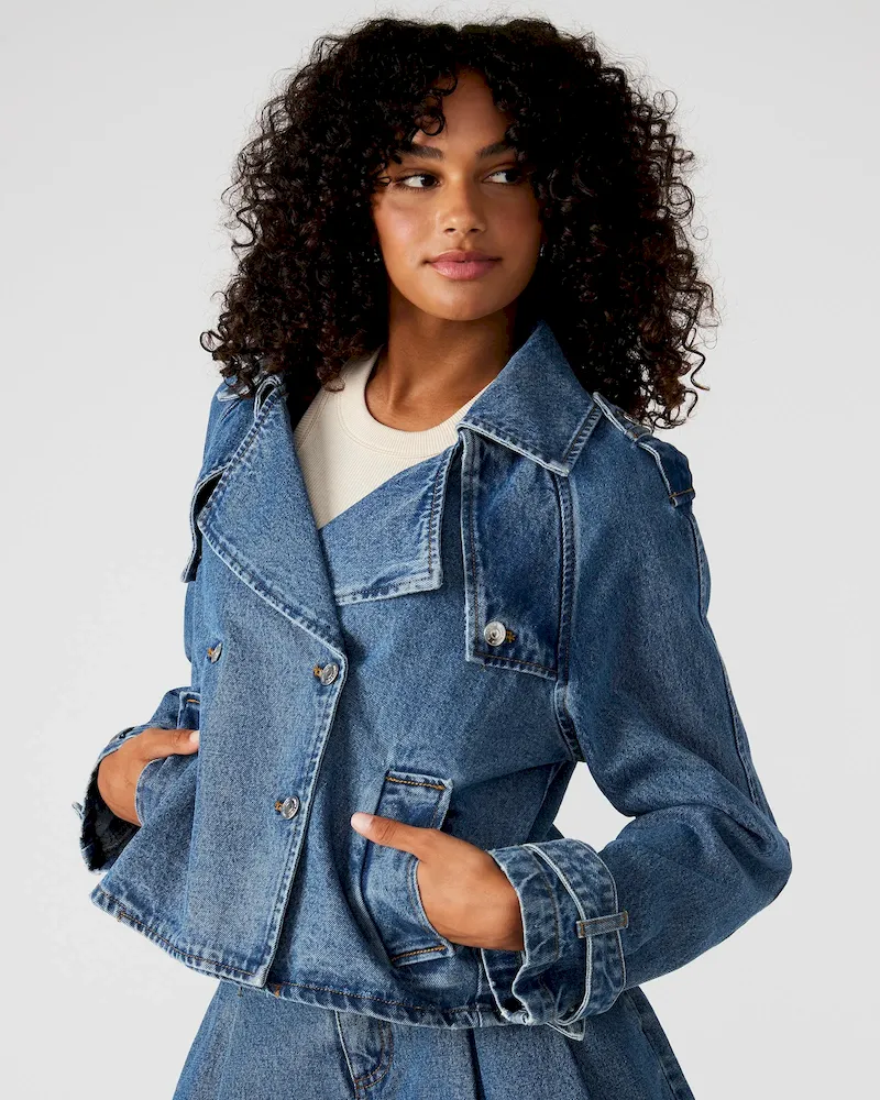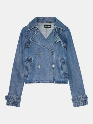 Enhance your wardrobe with the SIRUS denim jacket. This cropped trench boasts a double-breasted design and features two functional side pockets. The two wind flaps provide added functionality while the shoulder epaulettes and sleeve cuff belts add a touch of style. Complete with a pleated back flap, this jacket is both practical and chic.