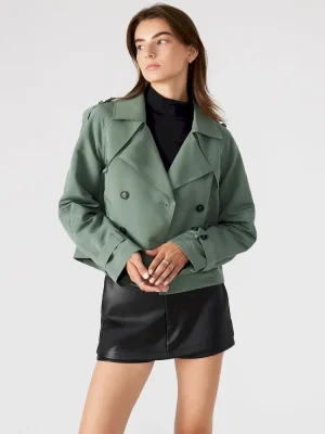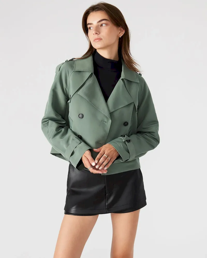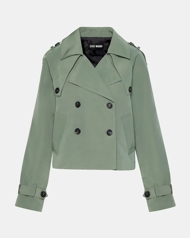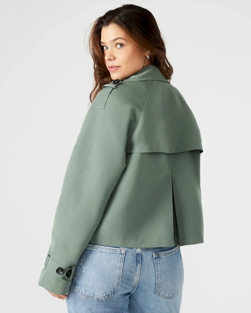 Enhance your wardrobe with the SIRUS jacket. This cropped trench boasts a double-breasted design and features two functional side pockets. The two wind flaps provide added functionality while the shoulder epaulettes and sleeve cuff belts add a touch of style. Complete with a pleated back flap, this jacket is both practical and chic.