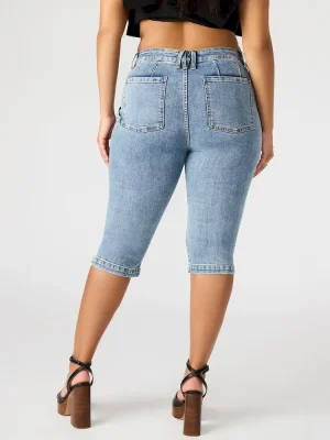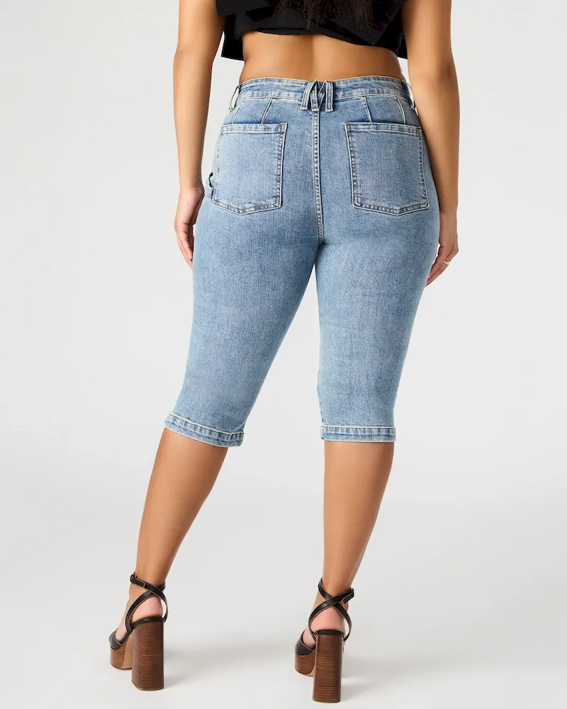 Elevate your daily denim game with our skinny DELRAY capri pants. Crafted with a comfy denim fabric, this pant features a front zipper and shank button for easy wear. Functional back pockets provide storage and convenience. Upgrade your wardrobe with this must-have staple.