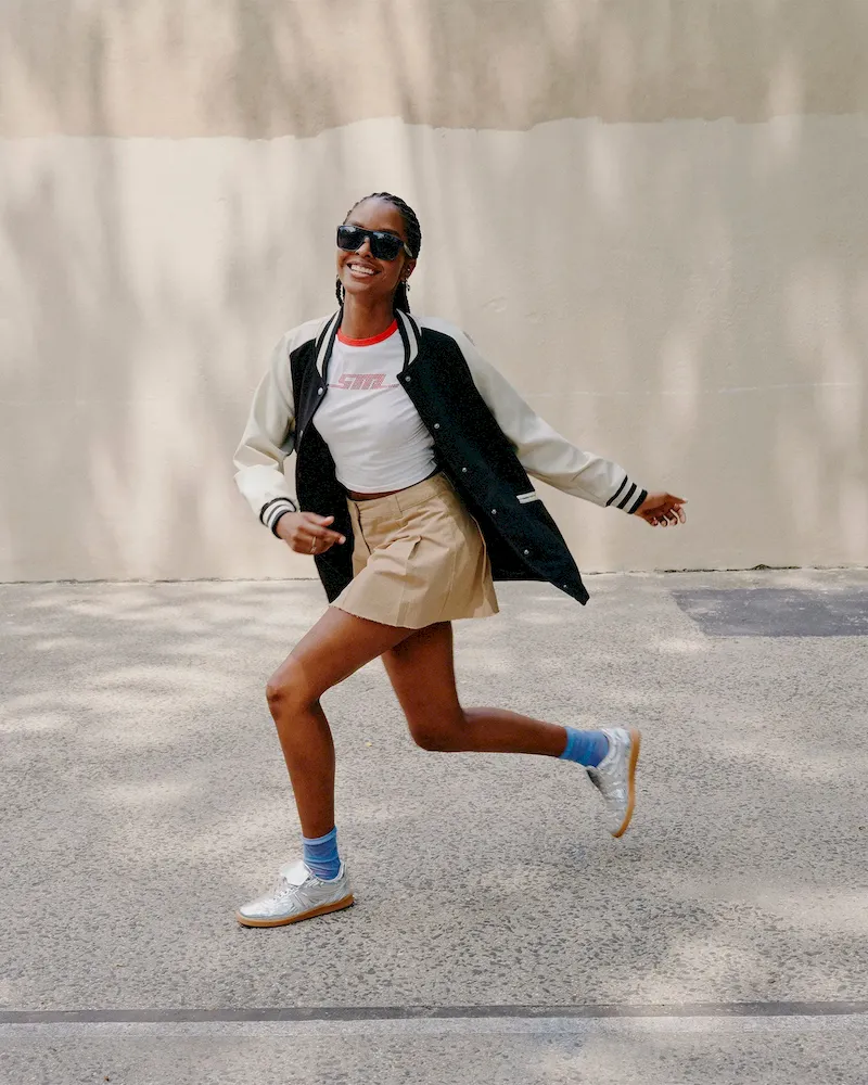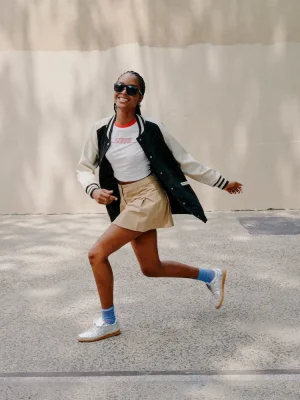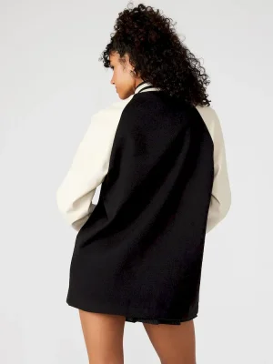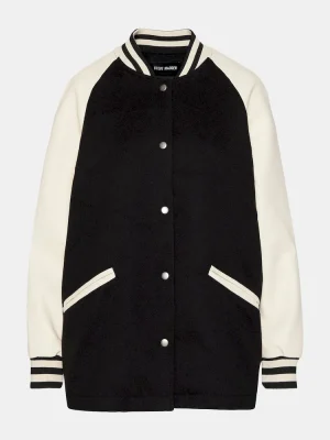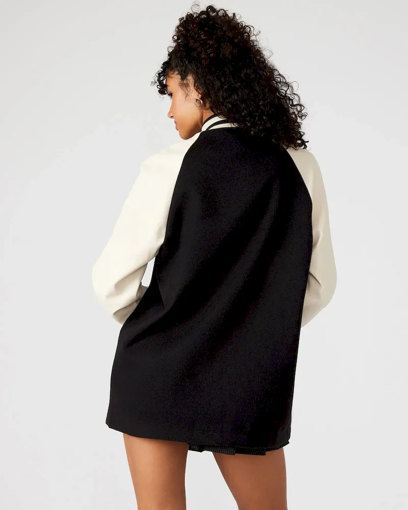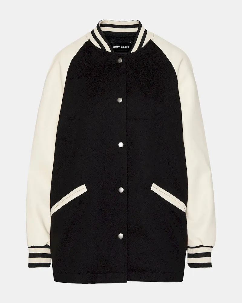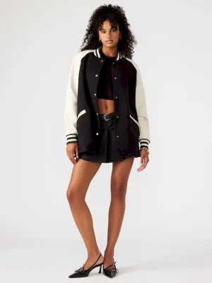 Introducing the SKYLIE jacket – the perfect blend of style and functionality. This varsity stadium jacket features a striped knit rib at the collar and cuffs for added design flair, while the snap closure and fully lined interior make it a practical choice. With contrast sleeves, this jacket is a must-have for any fashion-forward individual.