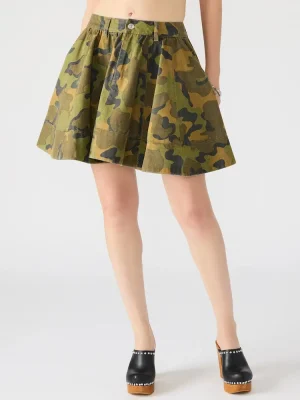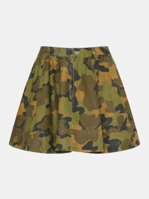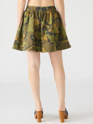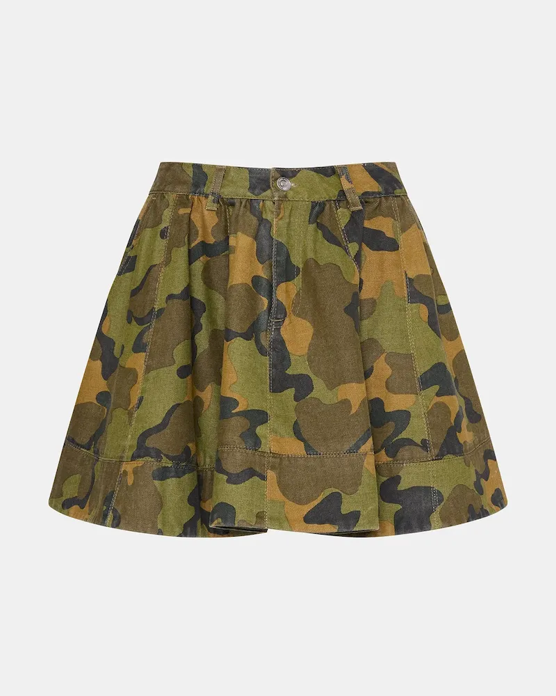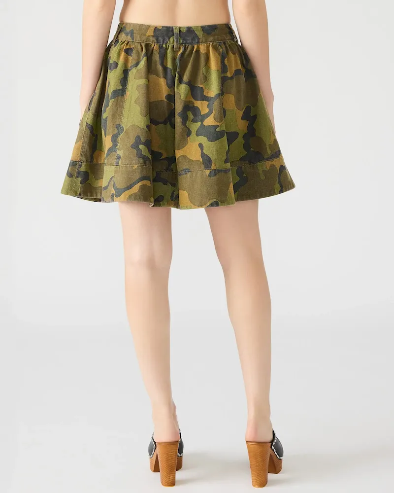 Expertly crafted SLOAN skirt features a flattering A-line silhouette in durable denim with a contemporary camo print. The versatile design transitions seamlessly from casual daywear to evening outings, offering both style and functionality with its figure-enhancing cut and distinctive pattern.