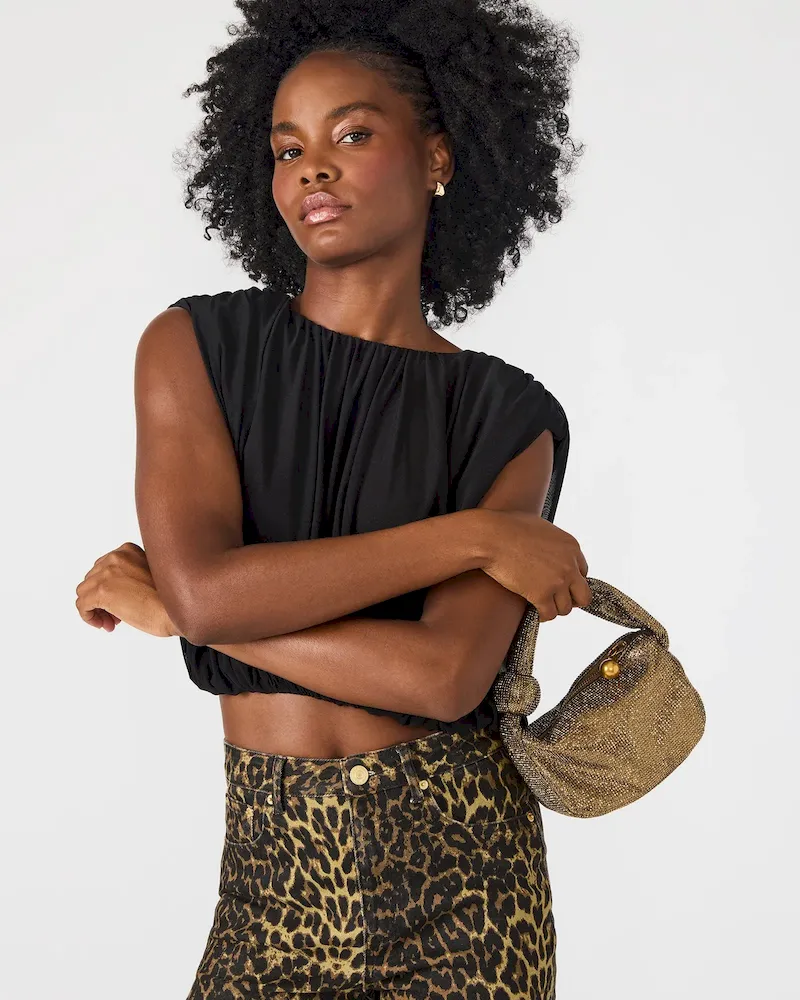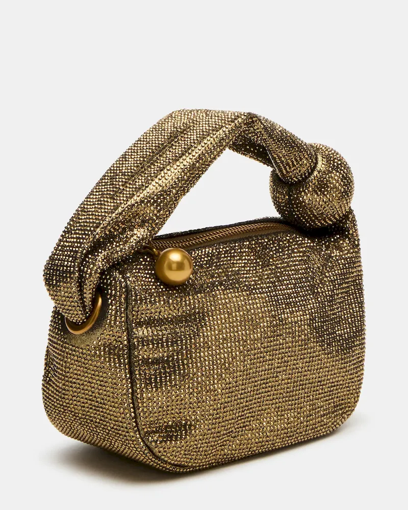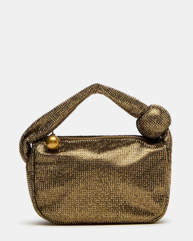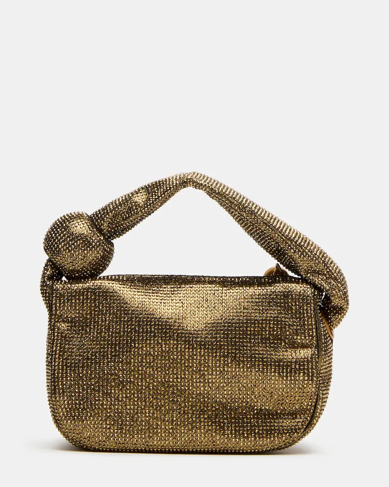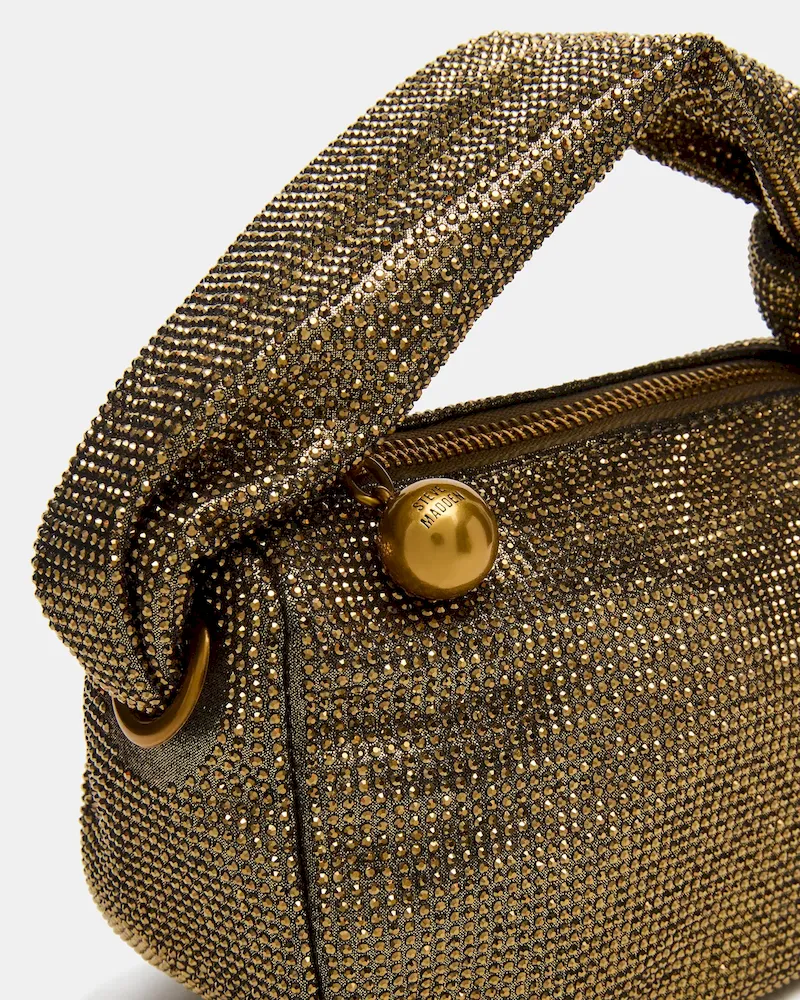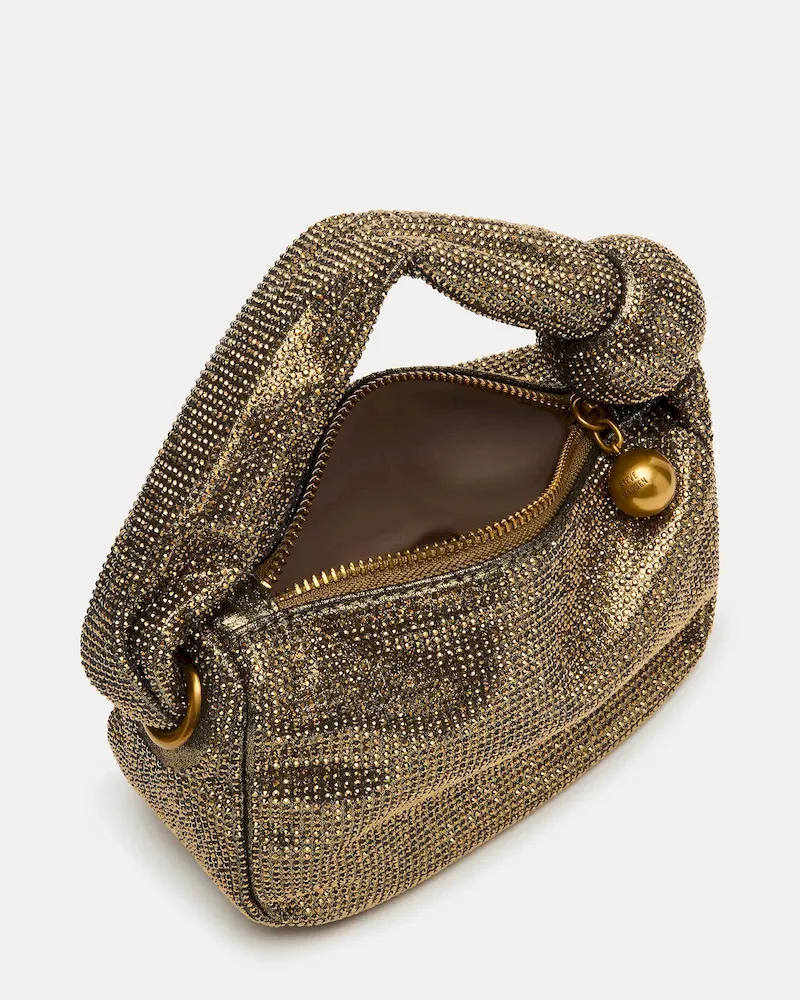 Introducing the SPARKLY bag. This evening top-handle bag boasts a soft design and decorative puller, perfect for dressing up or down. The crystal-encrusted detail adds a touch of glamour while fitting a phone for convenience.