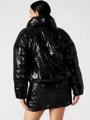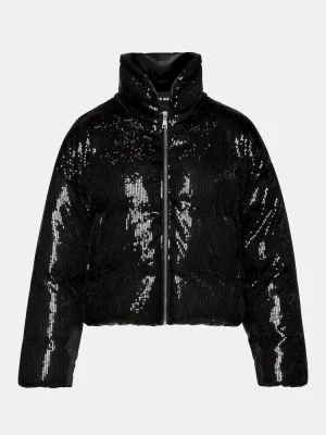 This STRATTO sequin puffer jacket features a zipper closure and long sleeves. The stylish design and high-quality materials provide both warmth and fashion-forward appeal. With a flattering fit and versatile design, this jacket is a must-have for any fashion enthusiast.