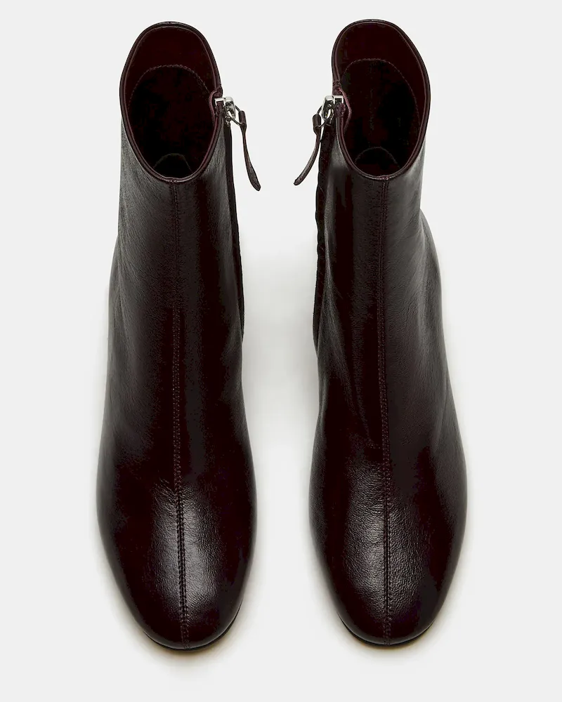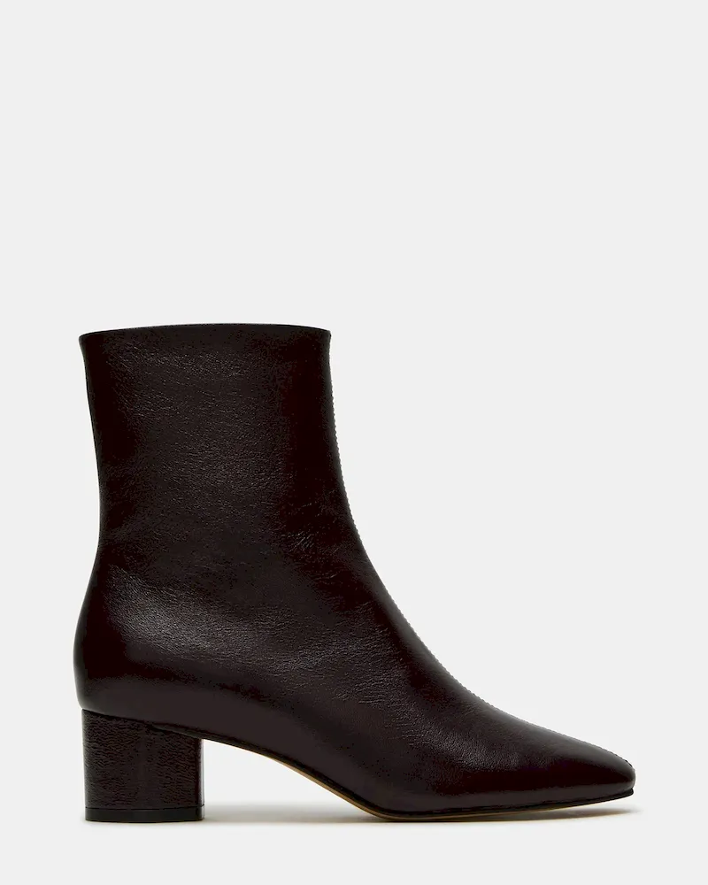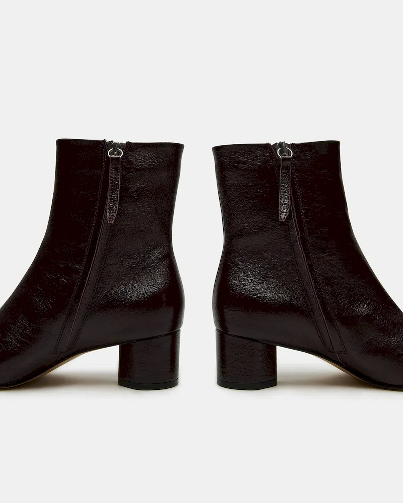 The STROME ankle boot features a rounded toe and a sturdy block heel, combining classic style with reliable support. Crafted for both comfort and durability, this bootie is an excellent choice for elevating your wardrobe with a sleek, polished look. Its unique finish adds a sophisticated shine, making it versatile for day-to-night wear.