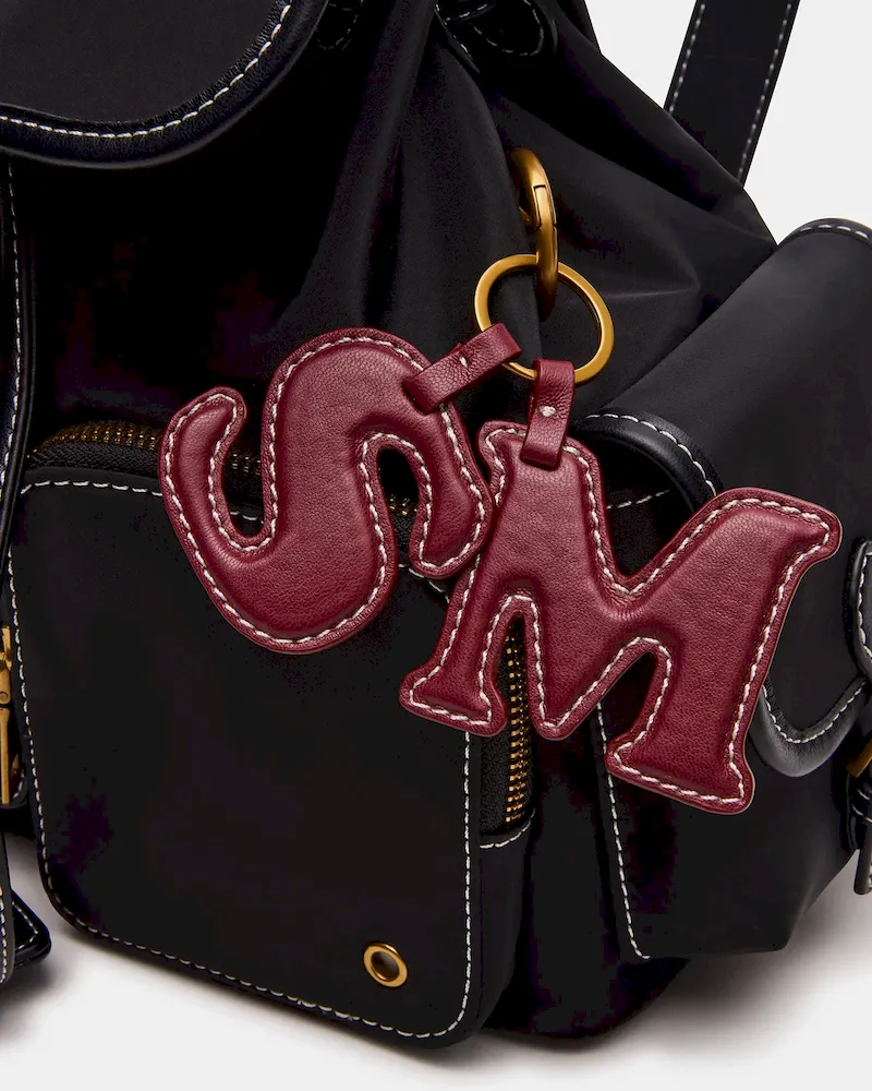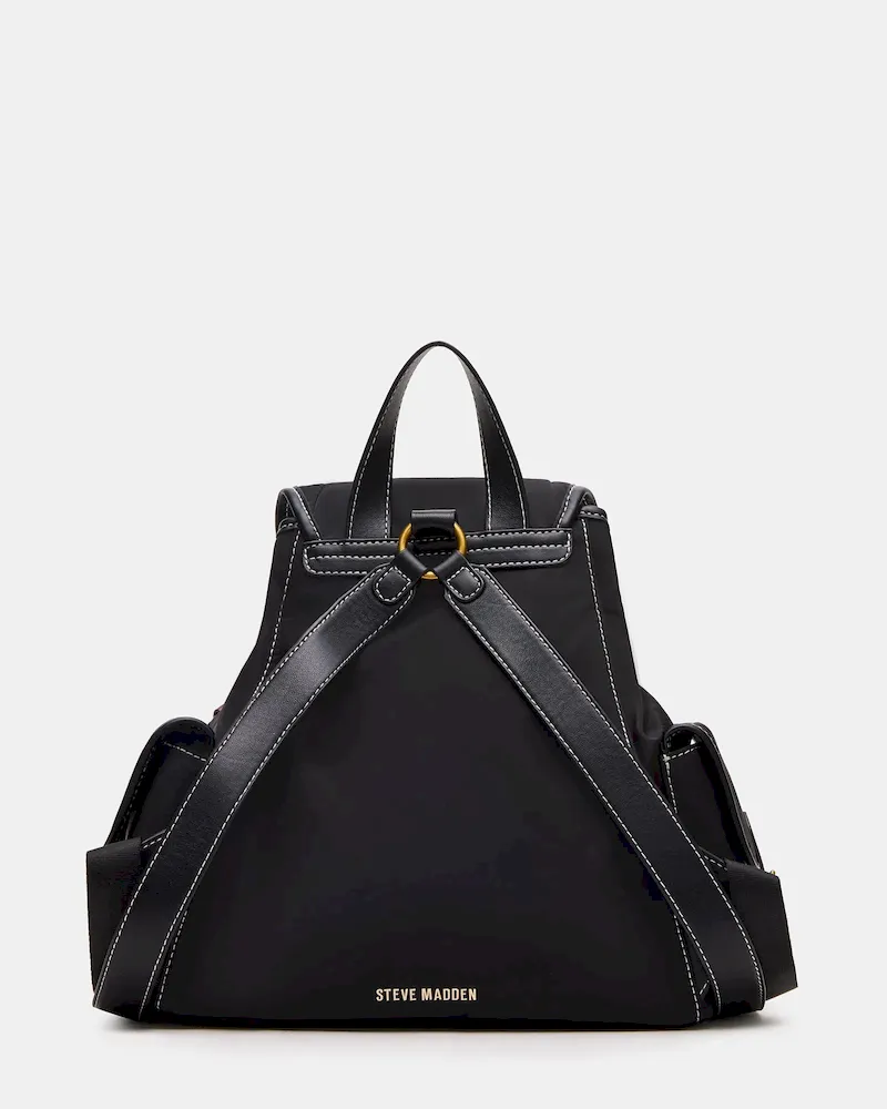 This STUDIO BAG BLACK is a nylon preppy-inspired backpack featuring a mag snap and drawstring closure for secure and easy access. Designed with multiple exterior pockets and two front slip pockets inside, it offers organized storage for daily essentials. The back zipper pocket adds convenience, while adjustable straps and detachable logo charms enhance both comfort and style. Ideal for those seeking a functional yet fashionable accessory.
