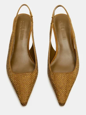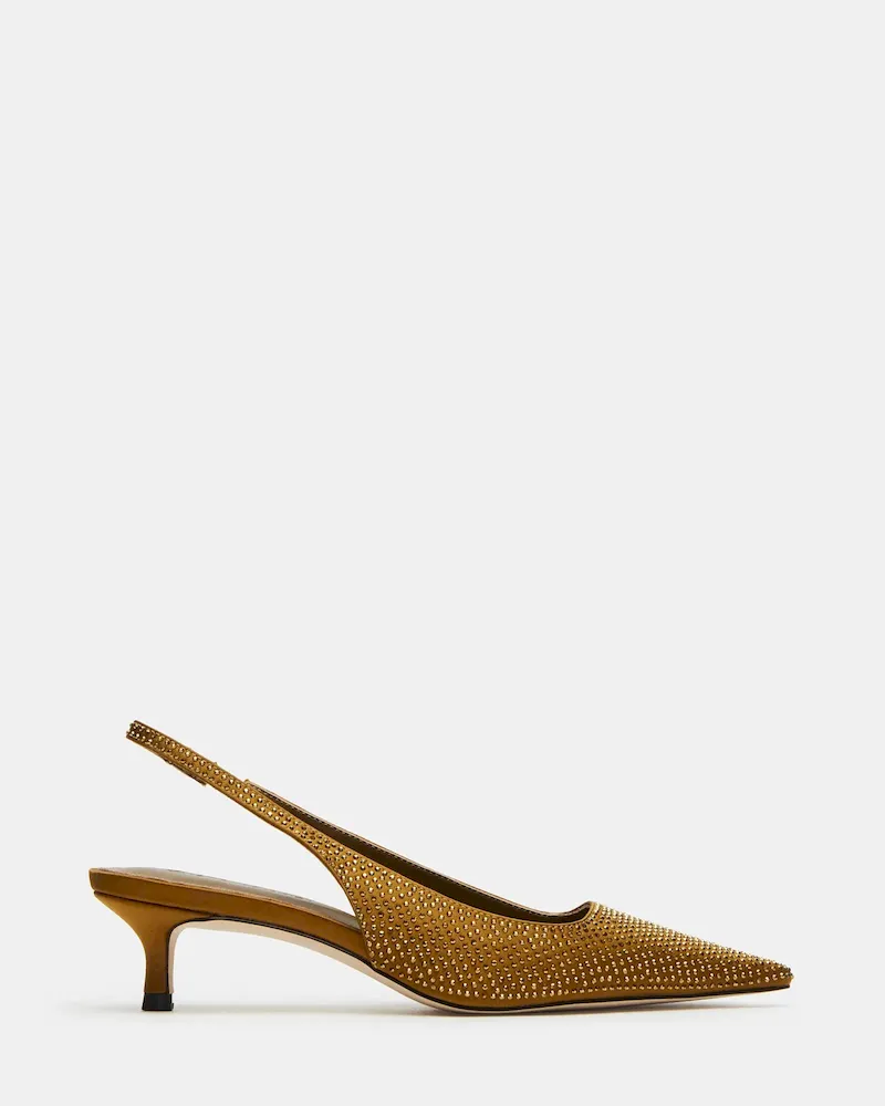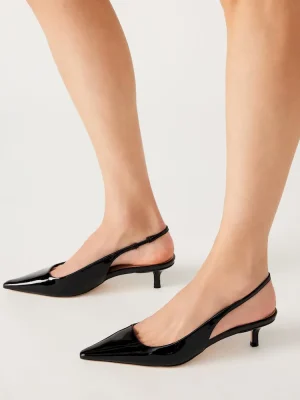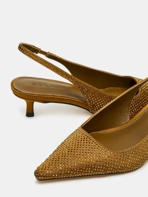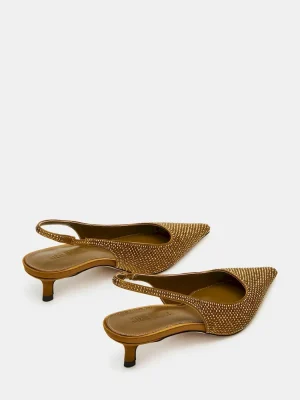 The KARI pump features a point toe, a low kitten heel, and a slim slingback strap for a sleek and streamlined silhouette.Point toe slingback kitten heel muleSlip-on style with slingback strap2 inch heel heightTextile upper material with stonesLeather liningLeather sockSynthetic soleImported