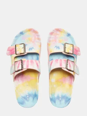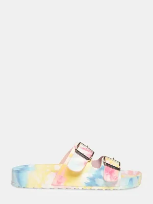 rFamous for comfort, this dual-strapped sandal takes fresh fashion cues from bold new hues and patterns ranging from trippy tie-dye to fierce feline spots. rrrSynthetic upper materialrrTextile liningrrSynthetic sockrrSynthetic solerr1 inch heel heightrr Imported