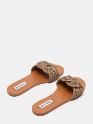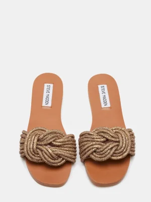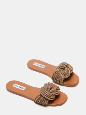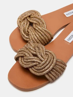 PRETTY + RELAXED + GLITZYThe ADORE sandals are a flat slide design with a wide front strap made up of shimmering embellished cords in a flat square knot.Embellished flat slide sandalSlip-on styleWide knotted top strap with allover stone embellishment.25 inch heel heightTextile upper material with rhinestonesVegan leather liningSynthetic soleImported