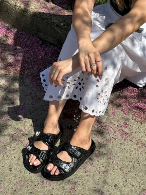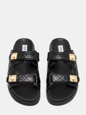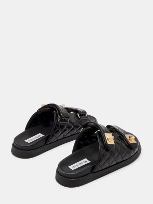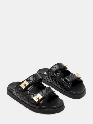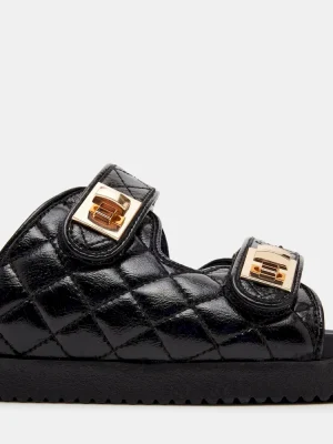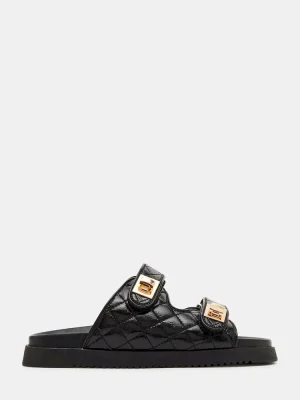 Indulge in luxury with the SCHMONA slide sandal. The quilted material gives a touch of opulence, while the turn-lock clasps add a sophisticated detail. The double strap design provides comfort and elegance in one. Elevate your style with this exclusive and tasteful choice.1.25 inch heel heightLeather upper materialSynthetic liningSynthetic sockSynthetic soleImported
