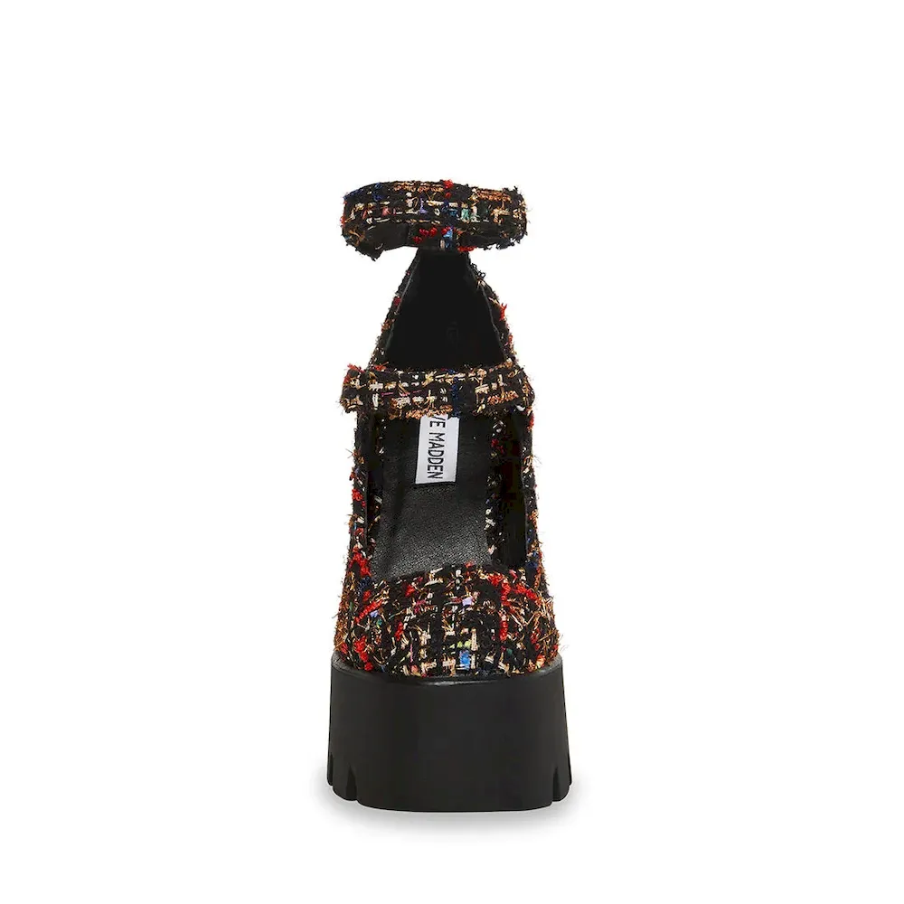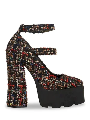 GLAM + SWEET + EXTRAThe HARUKO platform pump takes a Mary Jane design and adds a high block heel, plus an ankle strap for extra stability.Platform high heel Mary JaneHook-and-loop closure at top and ankle strapsHigh block heel with treaded front platformAlmond toe5.5 inch heel height1.75 inch platformTextile upper materialVegan leather liningSynthetic soleImported