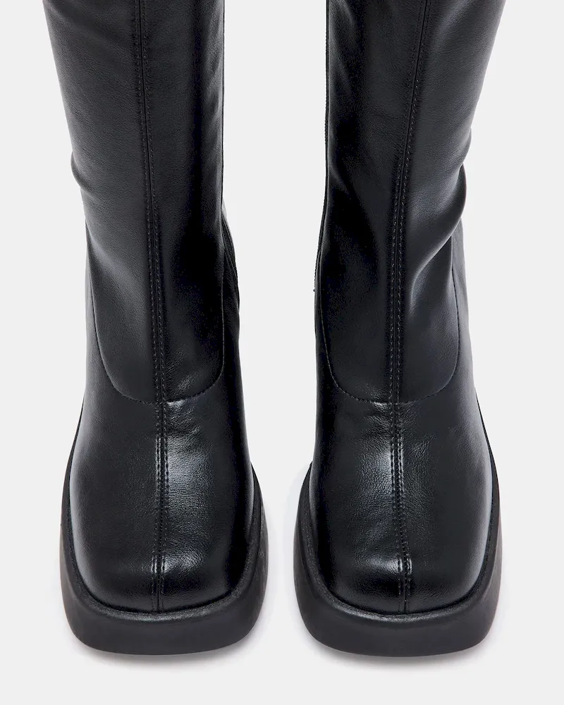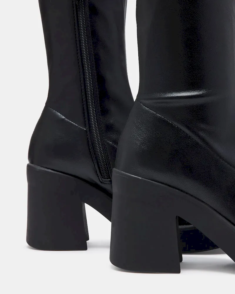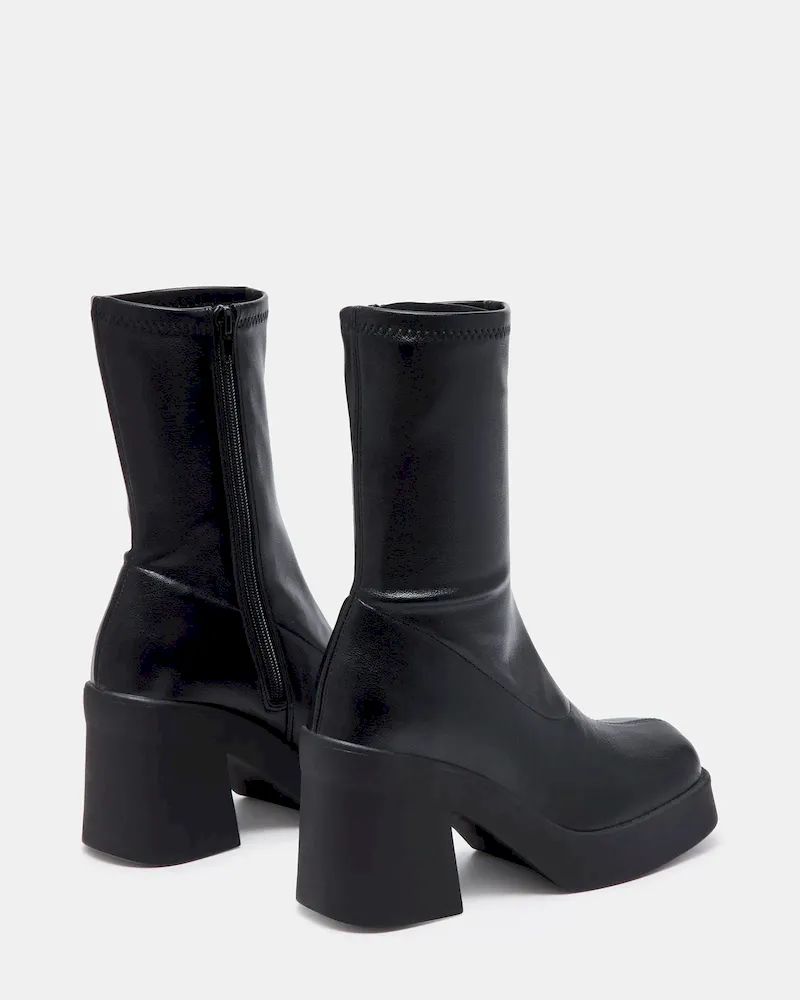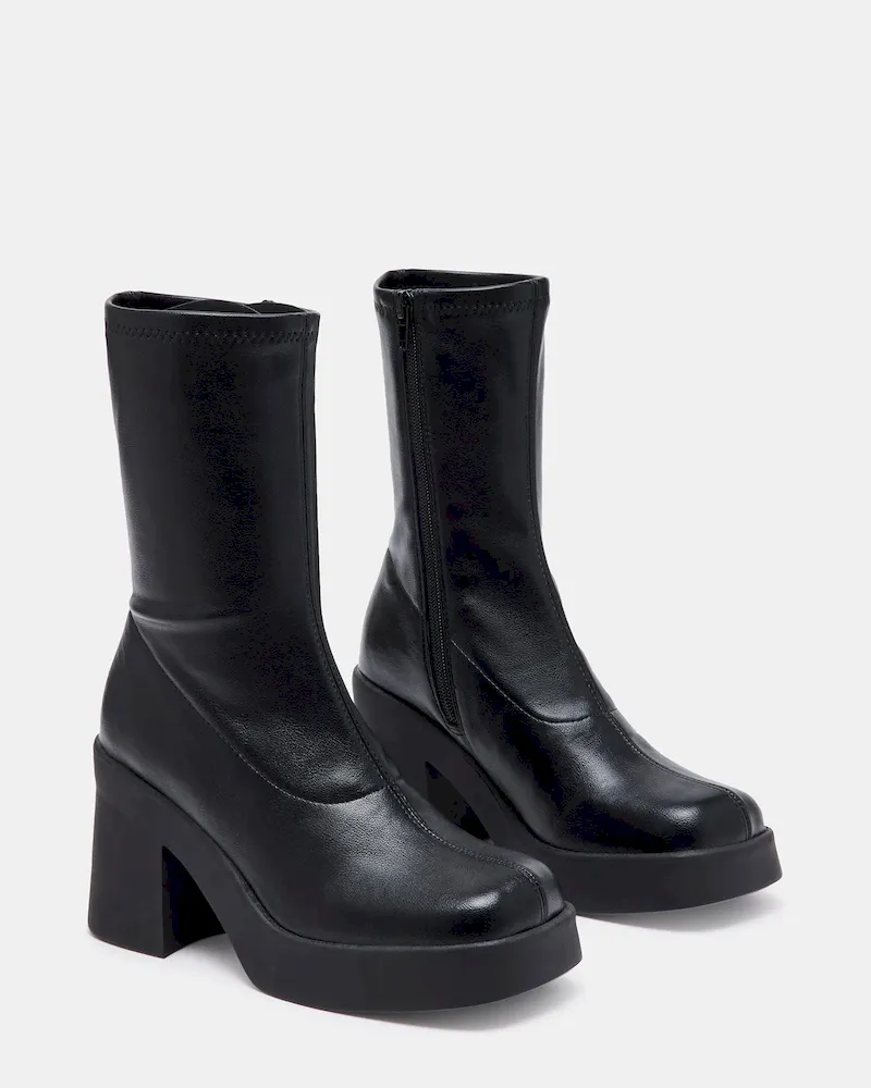 Bring a retro twist to all your looks in KLAYTON. Set on a thick platform sole, these 70s-inspired boots have a close sock-like fit and go with everything from midi skirts to floral dresses.The ultimate throwback!Stretch upper to fit most leg sizesMid-calf shaft heightLooks great with dresses and denim3.5 inch heel height1 inch platform9.75 inch shaft circumference8 inch shaft heightVegan leather or textile upper materialTextile and synthetic liningVegan leather sockSynthetic soleImported