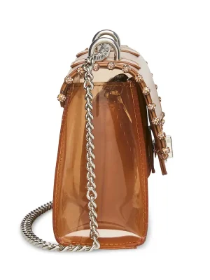 rrCrossbody handbagrrSilver crossbody straprrFront turn lockrrRemovable inside pouch with zip toprrJewel embellishments lining front flaprr5” H x 8’ L x 3” Drr Imported Imported