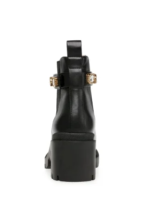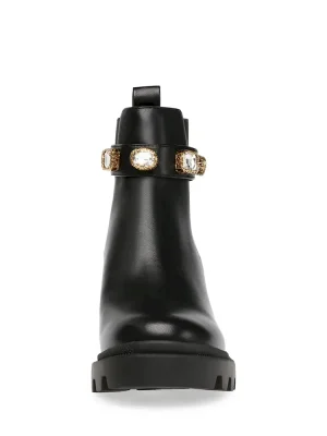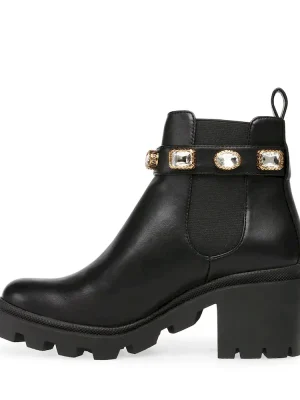 Jewelry-meets-footwear! A rhinestone-adorned strap elevates AMULET’s stretchy pull-on shaft, while a chunky heel and treaded sole provide support and stability. Chelsea boot with a removable jewel strapComfortable unit bottomVegan leather upper materialVegan leather and twill fabric liningRubber sole2 inch heel height11 inch shaft circumference4.5 inch shaft height Imported