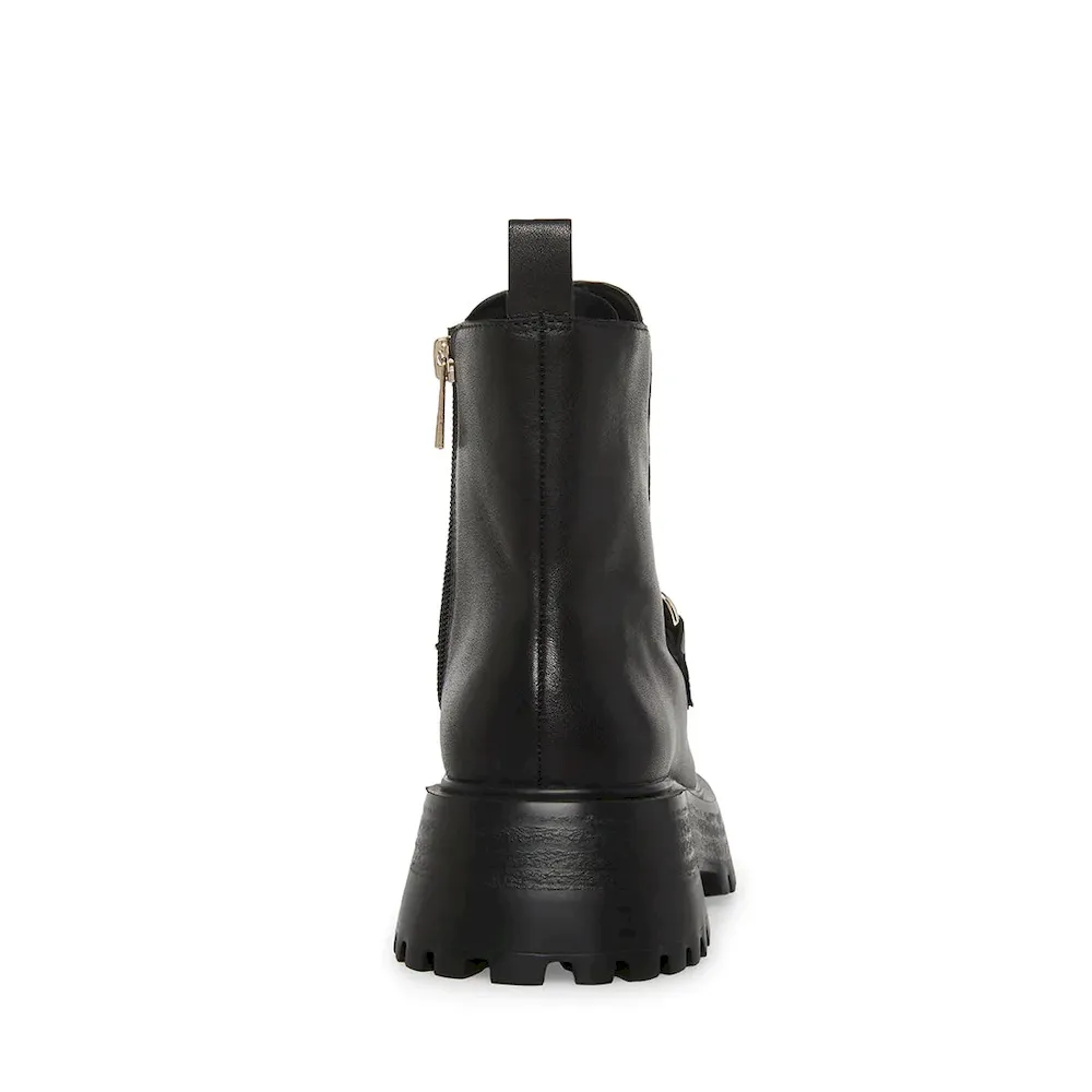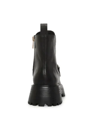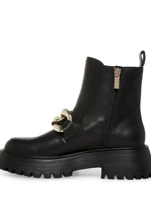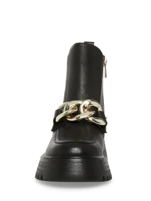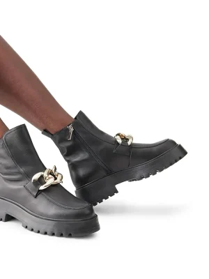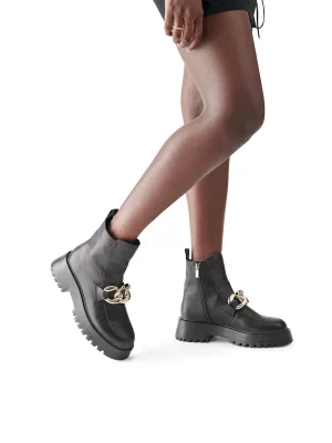 RELAXED + TOUGH + CONTEMPORARYThe CLEO ankle boots feature a roomy leather moc toe upper topped with an oversized curb chain. A heavy tread gives the heeled sole a chunky look.Leather lug sole moc toe bootieSide zipper closureCurb chain detail across topMoc toe2 inch heel height10 inch shaft circumference5.25 inch shaft heightLeather upper material with hardwareTextile and synthetic liningSynthetic soleImported