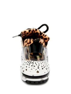 Fashion and function collide this season to form the CLIFF sneaker — a hot new standout with a collaged construction and playfully exaggerated proportions. Incorporating mixed prints and creative color blocking, this kick is suited for runways and city streets alike!Leather, fabric, and man-made upper materialTwill fabric liningRubber sole2.5 inch heel height.5 inch platform Imported Imported