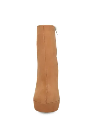SLEEK + DRAMATIC + SEXYThe DALINA leather ankle boots are elevated on a high block heel with a front platform, finished with a point toe.Leather platform heel bootiesSide zipper closureBlock heel with front platformPoint toe5.25 inch heel height1 inch platform9.5 inch shaft circumference4.75 inch shaft heightNubuck leather upper materialSynthetic and textile liningSynthetic soleImported