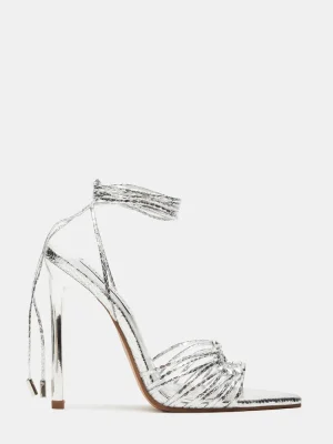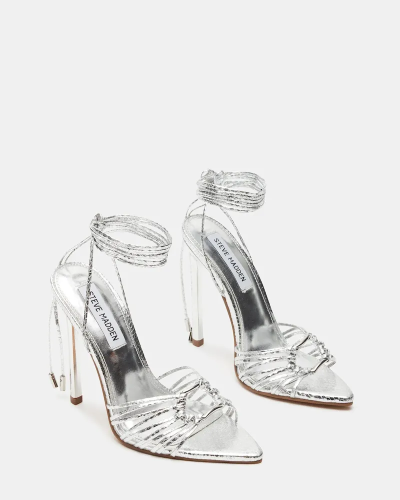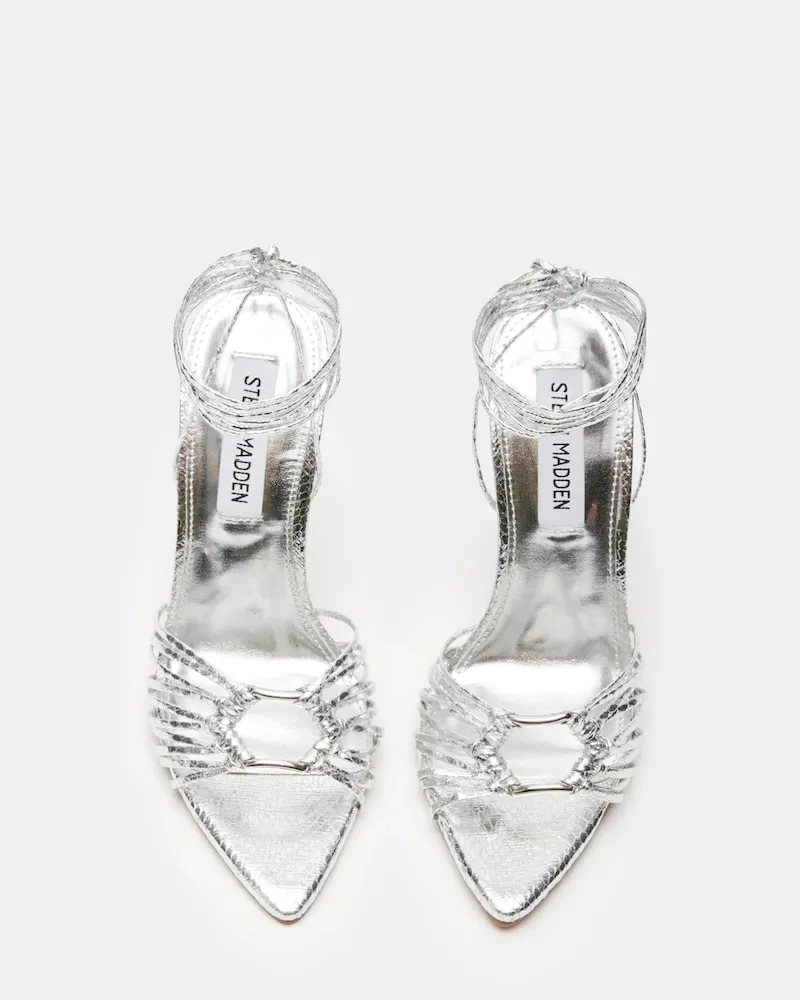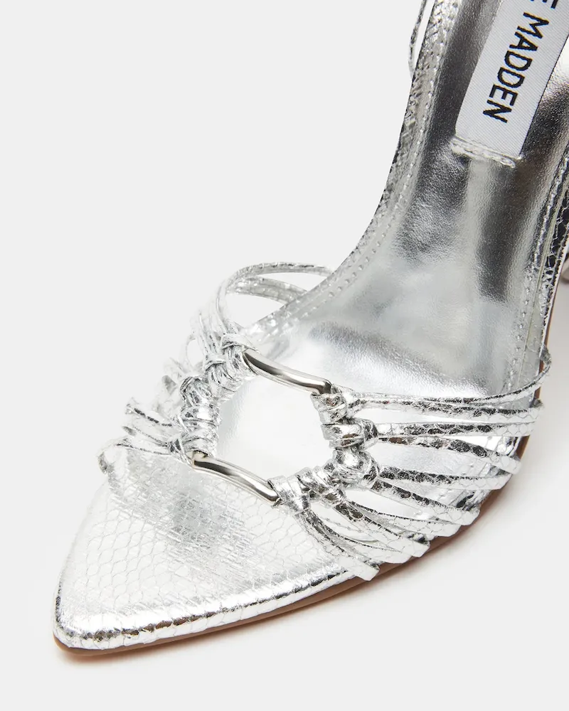 ZAYA sandal features a point toe stiletto silhouette and strappy upper accented with a hexagonal cutout over the toesPoint toe stiletto strappy sandalWrapped ankle tiesMetallic finishGeometric hardware at frontSynthetic upper material4.75 inch heel heightSynthetic lining Synthetic sockSynthetic sole Fit tip: if you are in between sizes, size up a half a sizeImported
