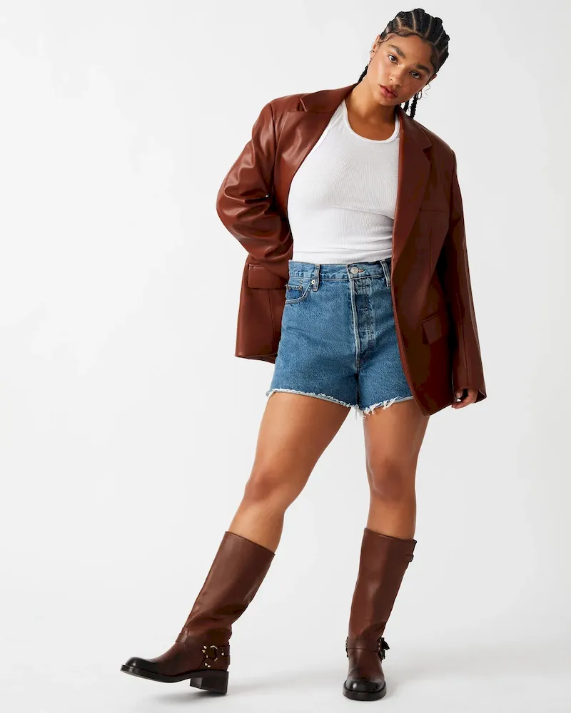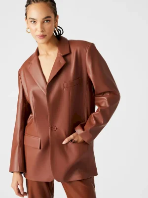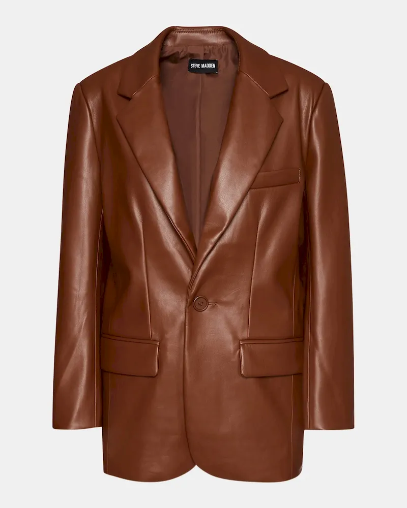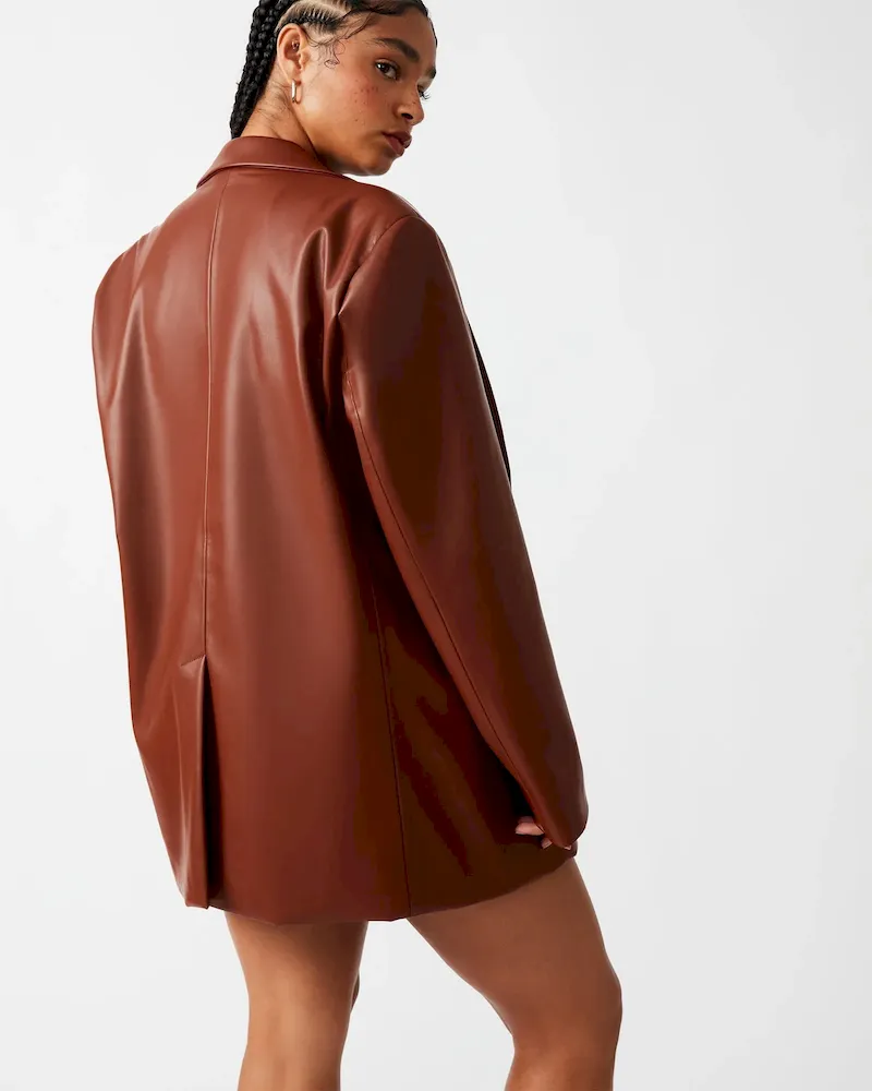 The IMAAN blazer gives you the perfect relaxed structure for layering with a faux leather construction and an oversized boyfriend fit.Faux leather oversized blazerOne button front closureTwo front flap pocketsLength: 28.5″100% polyurethane Care instructions: wipe clean with a damp cloth, do not bleach, line dry, use pressing cloth and iron on low if necessary, do not dry cleanComplete the look with the MERCER pant or the FAUX THE RECORD shortJelixza is 5ft 9.5in and is wearing a size smallAiyana is 5ft 6in and is wearing a size largeFit tip: fit is oversized, size down for a more tailored lookImported