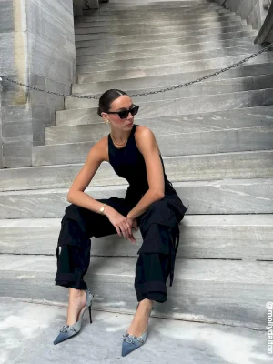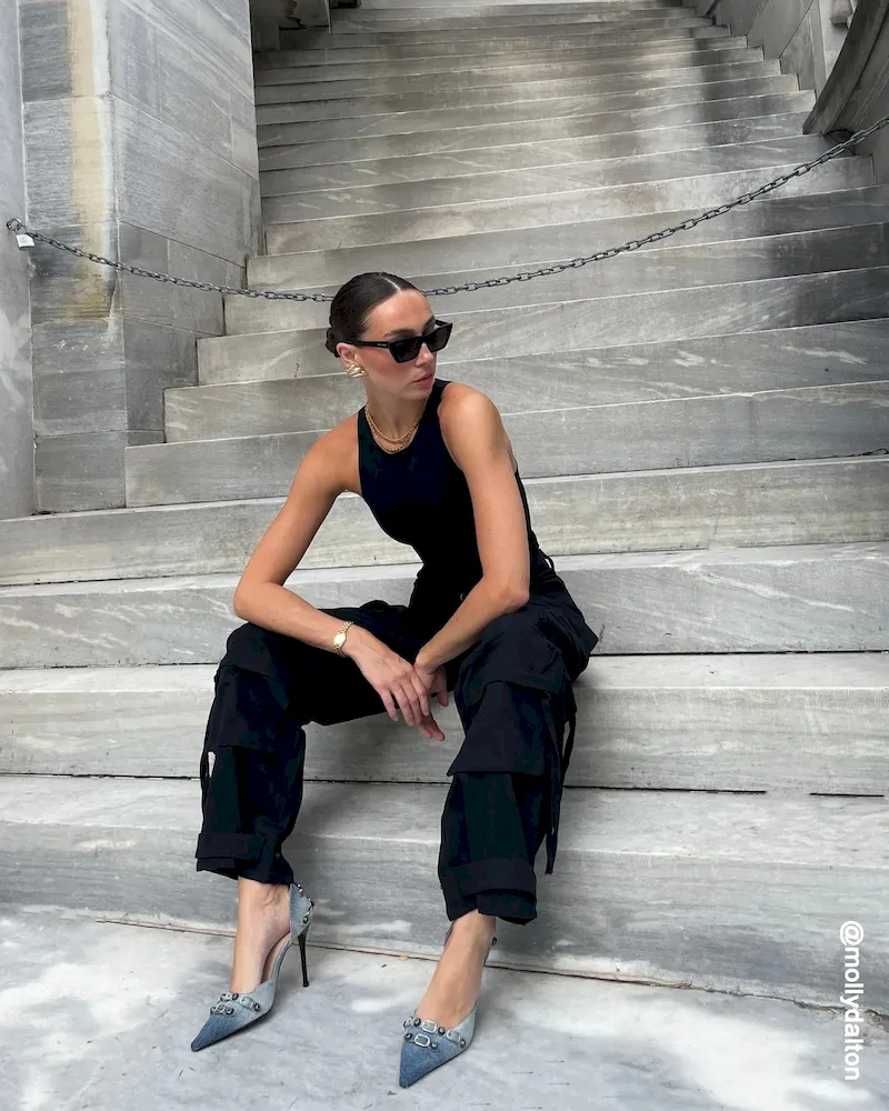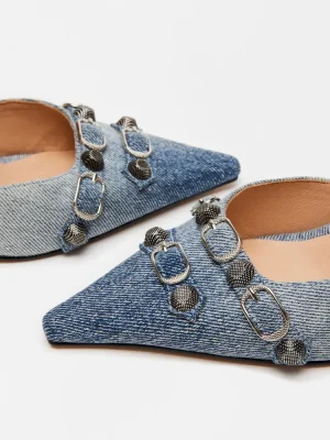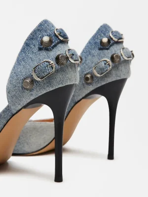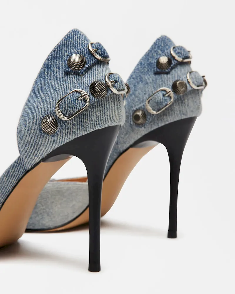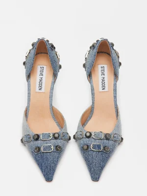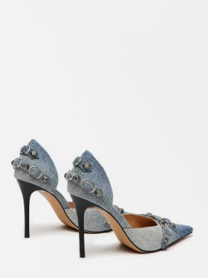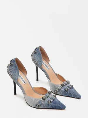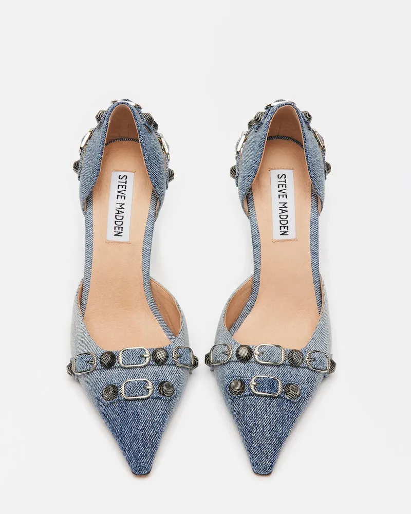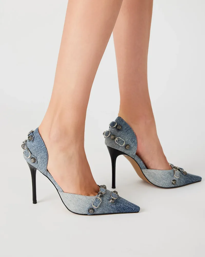 The DALI stiletto features substantial textured studs and buckles embellishing the point toe and the back of the ankle.Studded point toe stiletto pumpSlip-on styleStiletto heelStud and buckle hardware embellishmentPoint toe3.75 inch heel heightThis product is made with premium materials that are dyed and washed for special finishes. As a result, the product can vary slightly from the pictures.Textile upper material with hardwareLeather sockSynthetic liningLeather sockSynthetic soleImported