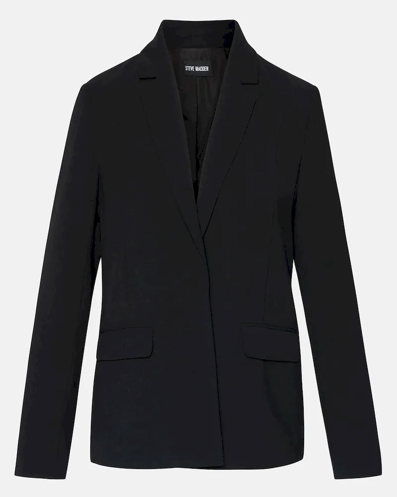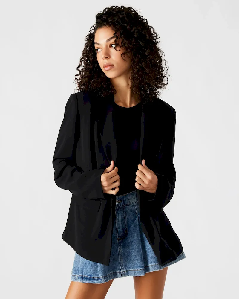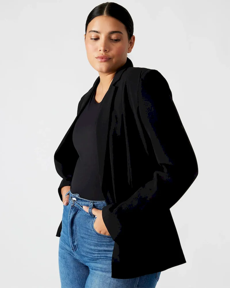 Throw on the PAYTON blazer over your OOTD for a touch of tailored style. The no-button cuffs and open front give this jacket clean, unbroken lines.Open front blazerNo closureFront flap pocketsNotched lapelLinedLength: 27″100% polyesterHand washShop the set hereEve is 5ft 9in and is wearing a size smallStephanie is 5ft 10in and is wearing a size largeFit tip: Fit is slightly oversized, size down for a more tailored lookImported