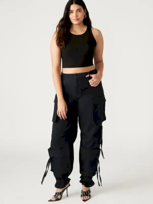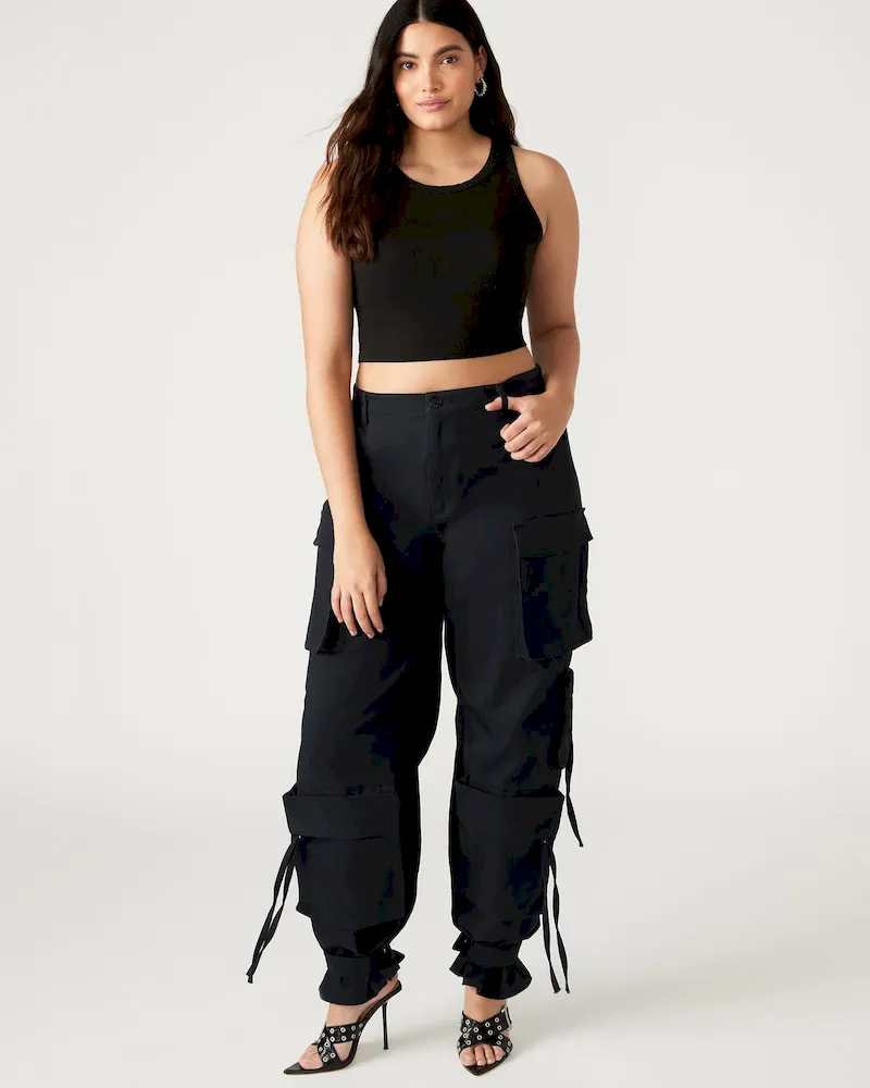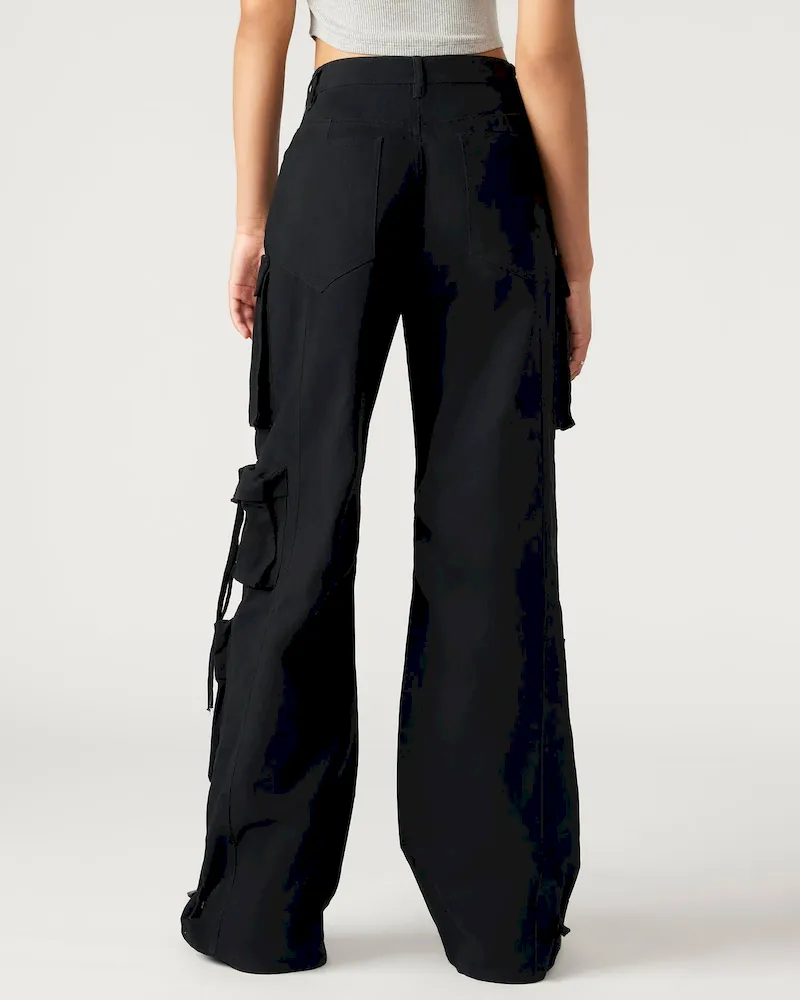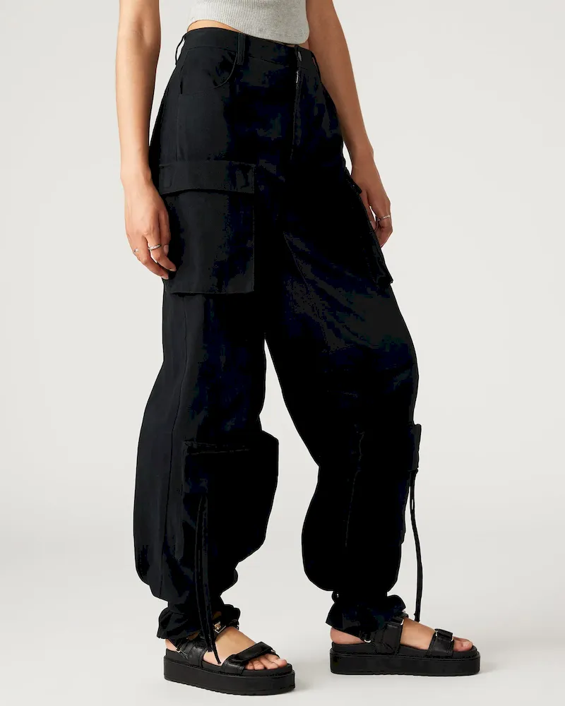 Midweight cotton twill fabric gives the wide leg DUO cargo pants just the right amount of structure and volume. Snap straps around the ankle allow you to cinch the cuffs to adjust the silhouette.Mid rise cargo pantsZipper fly with shank button closureTwo side pockets, two back patch pockets, and five cargo pockets down the legsBottom 3 cargo pockets feature extended zipper pullsSnap strap at hem to cinch anklesInseam: 31″100% cottonCare instructions: hand wash cold separately, do not bleach, lay flat to dry, low iron if necessary, or dry cleanStephanie is 5ft 10in and is wearing a size large Nina is 5ft 10in and is wearing a size small Fit tip: style is baggy, size down for a more fitted lookImported