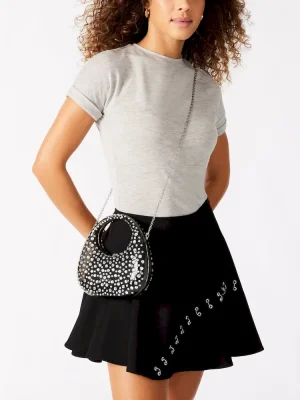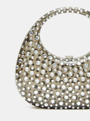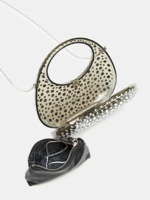 The DAZY bag is a structured clear shoulder bag with elegant rhinestone embellishments. It features a clutch snap closure for easy access and a removable, adjustable chain crossbody strap for versatile wearing options. Additionally, it comes with a convenient zipper closure pouch. Elevate your style with this glamorous and functional bag.Structured clear shoulder bagRhinestone stud embellishmentsClutch snap closureAdditional zipper closure pouchRemovable and adjustable crossbody strapCrossbody strap: 24 inchesShoulder strap: 3.5 inches8in H x 9in W x 2in DPVC materialsDuster bag included Imported