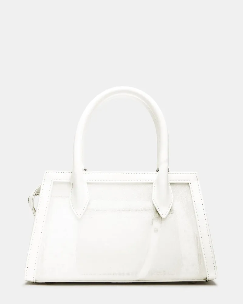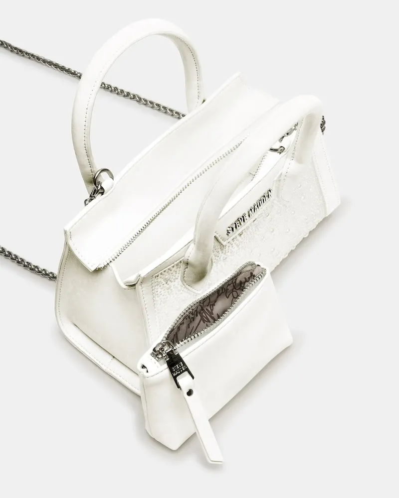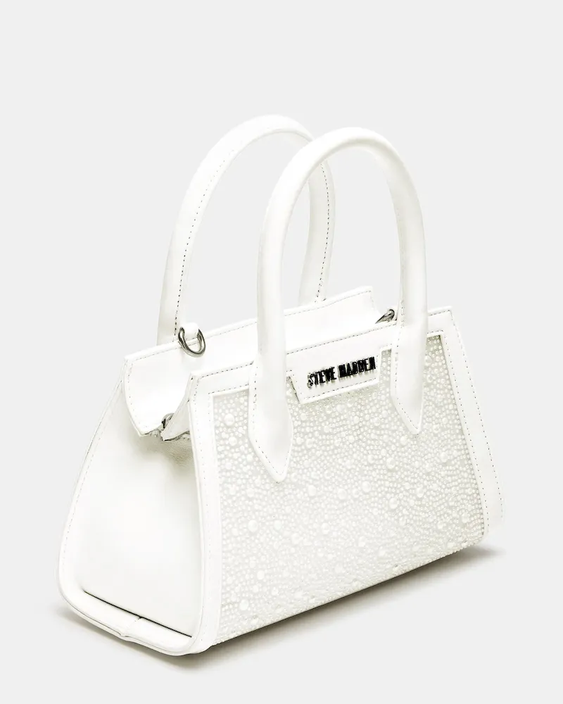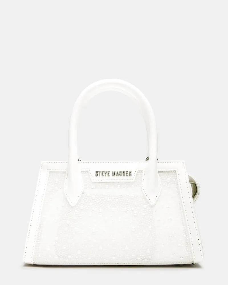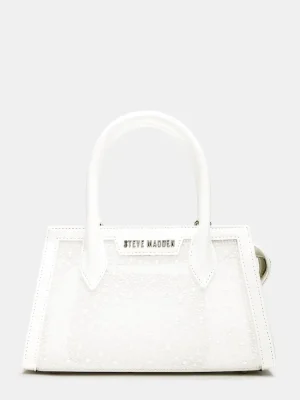 The PEACHY bag is a mini top-handle bag that combines style and functionality. Its unique design adds a touch of elegance, while the detachable chain crossbody strap offers versatile carrying options. The top zipper closure keeps your essentials secure, and the all-over mesh design adds a unique touch. Elevate your outfit with this must-have accessory.Mini top-handle bagTop zipper closureInside removable pouchRemovable and adjustable crossbody strapTop-handle strap: 3.75 inchesCrossbody strap: 24 inches 5.25in H x 9in W x 4in DSynthetic materials with pearlsDuster bag included Imported