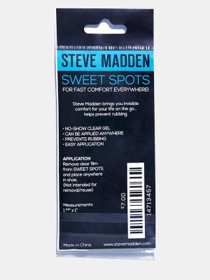 Steve Madden brings you invisible comfort for your life on the go….helps prevent against rubbing. SWEETSPOTS will help prevent painful blisters on your heels, and can be applied anywhere on your shoes to ease friction. Madden’s gel pads cushion your foot so you can walk all day (or night!) in comfort. They stay in place and keep your feet cool, dry and fresh.