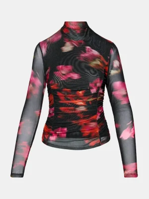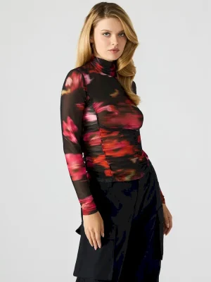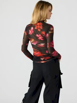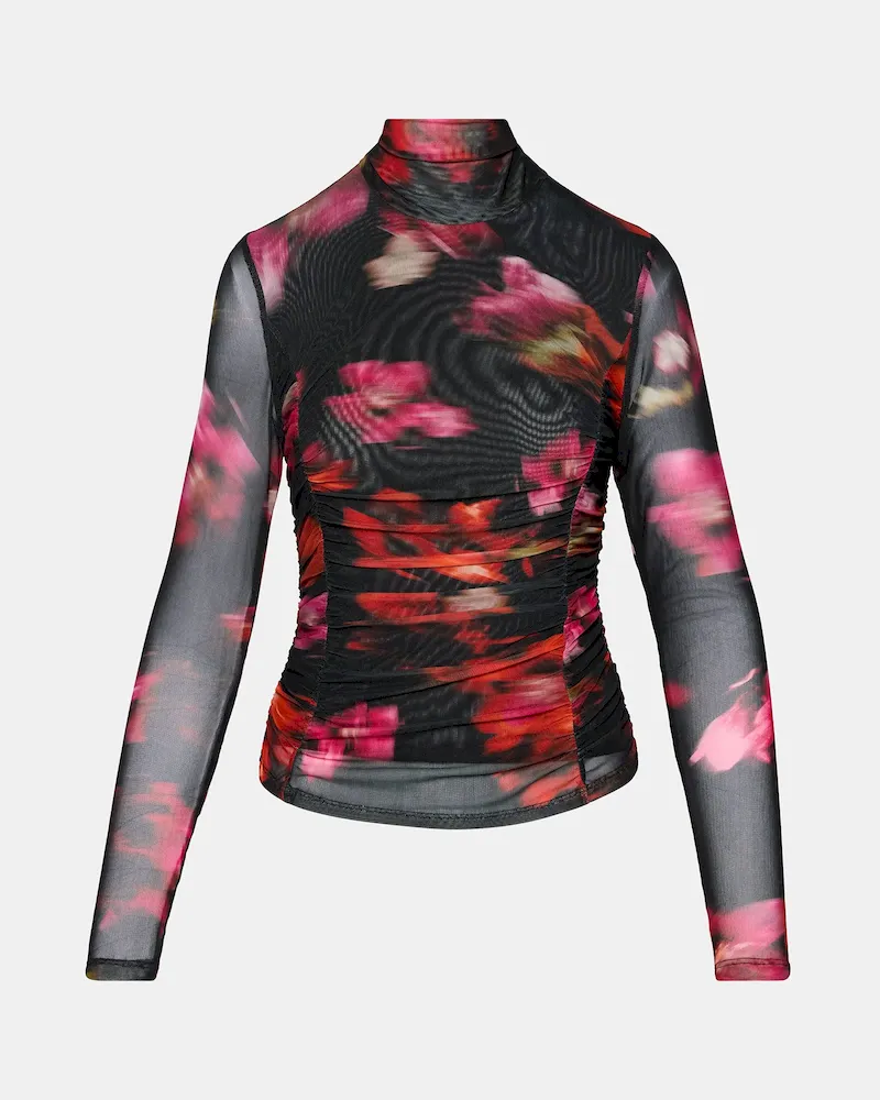 The TAYLORE TOP BLURRY FLORAL features a long-sleeved, mock neck design crafted from breathable mesh fabric. Its artistic floral print adds a modern edge, making it ideal for layering or wearing alone. This top combines style and comfort while offering a lightweight, form-fitting silhouette that enhances your wardrobe with subtle sophistication.