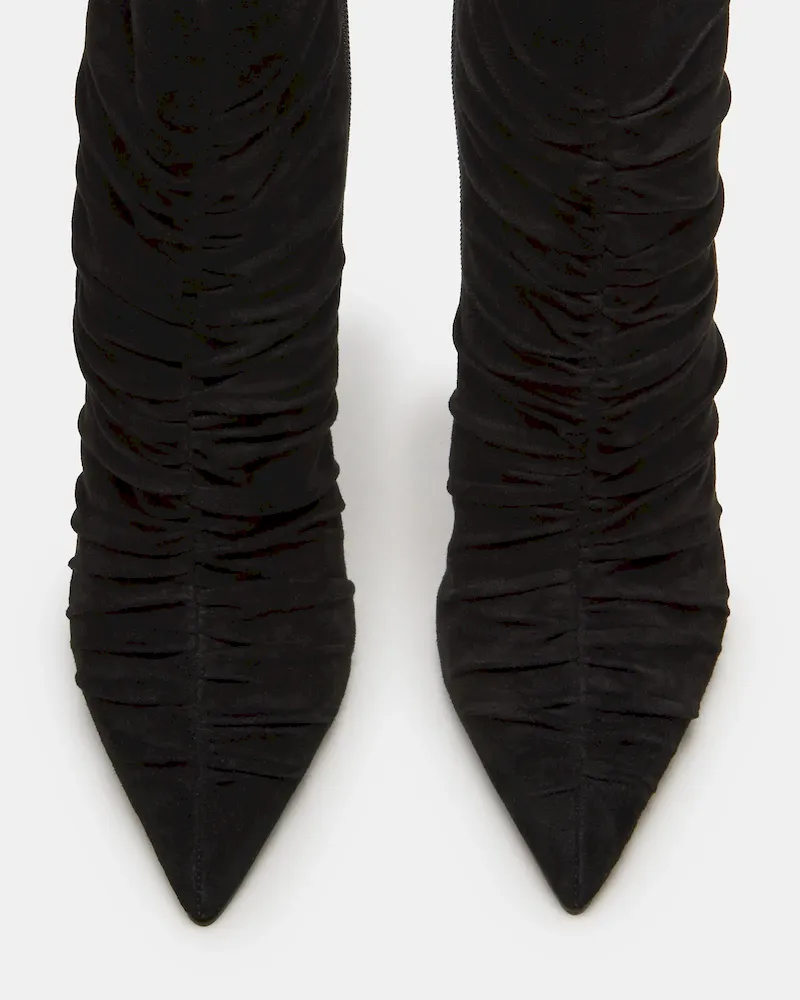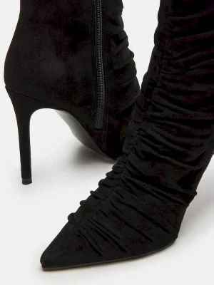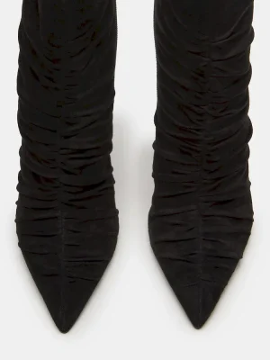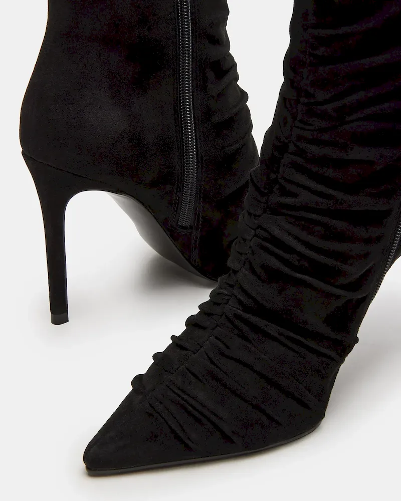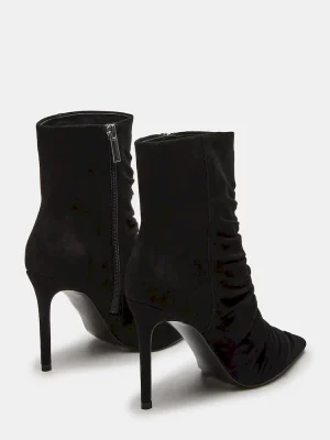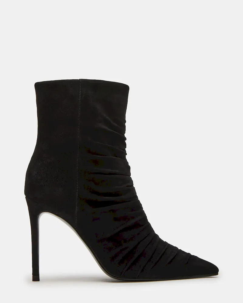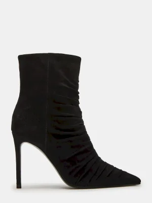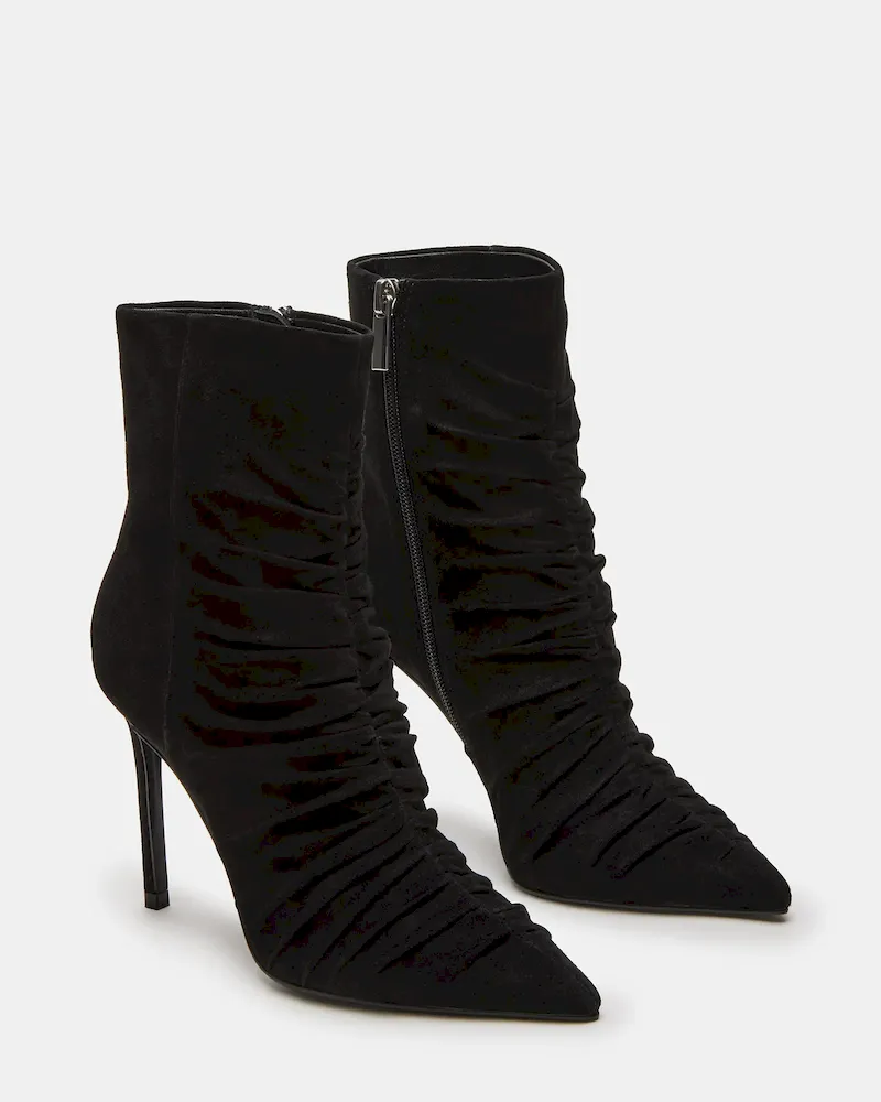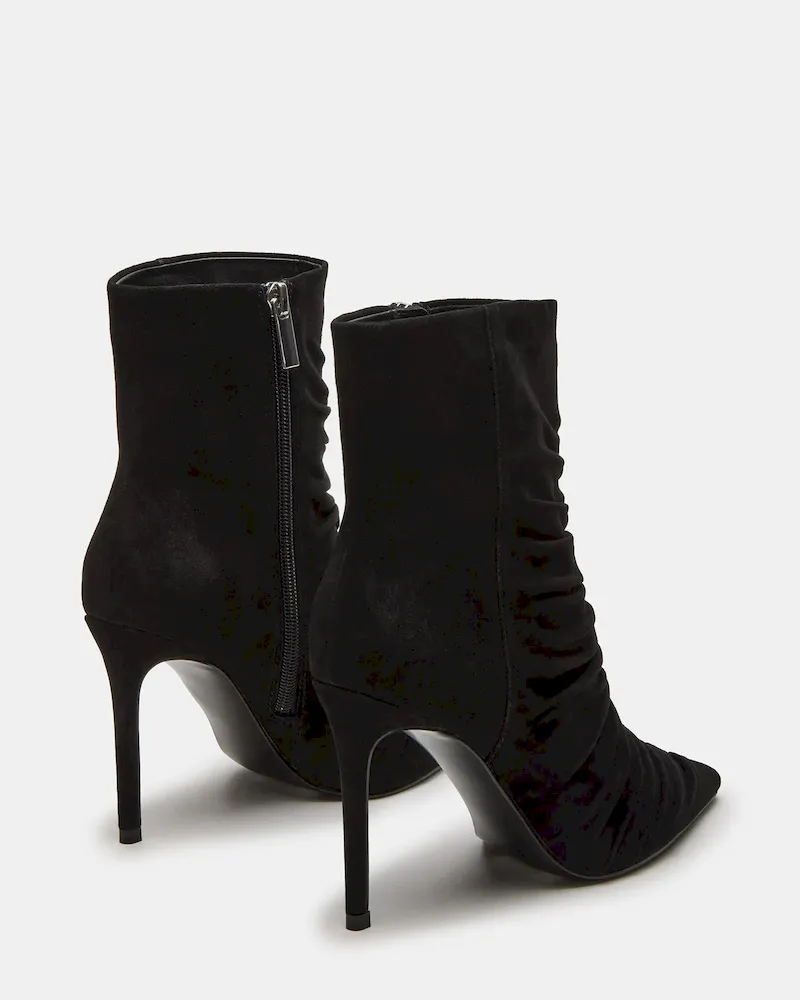 Expertly crafted for sleek and sophisticated style, the TEASE ankle bootie features a ruched design, pointed toe, and stiletto heel. Elevate any outfit with these luxurious, versatile shoes.