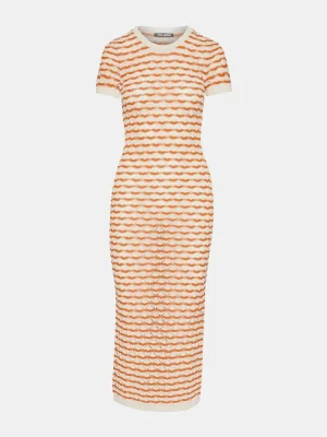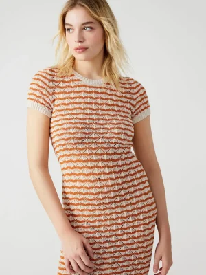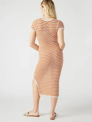 The THERESA sweater dress is a must-have for spring. This pointelle knit dress features a unique two-tone design with vibrant orange and white stripes. Its bodycon fit and ankle length make it perfect for any occasion. Stay on-trend with this striped maxi dress that also features short sleeves and a cheeky slit.